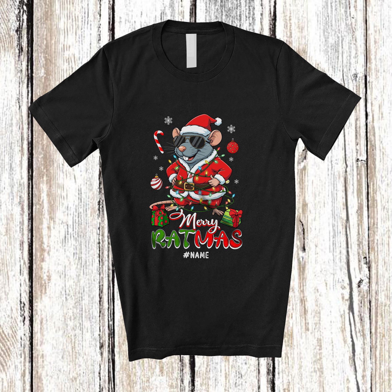 Personalized Custom Name Merry Ratmas; Fantastic Christmas Santa Rat Lover X-mas Lights T-Shirt