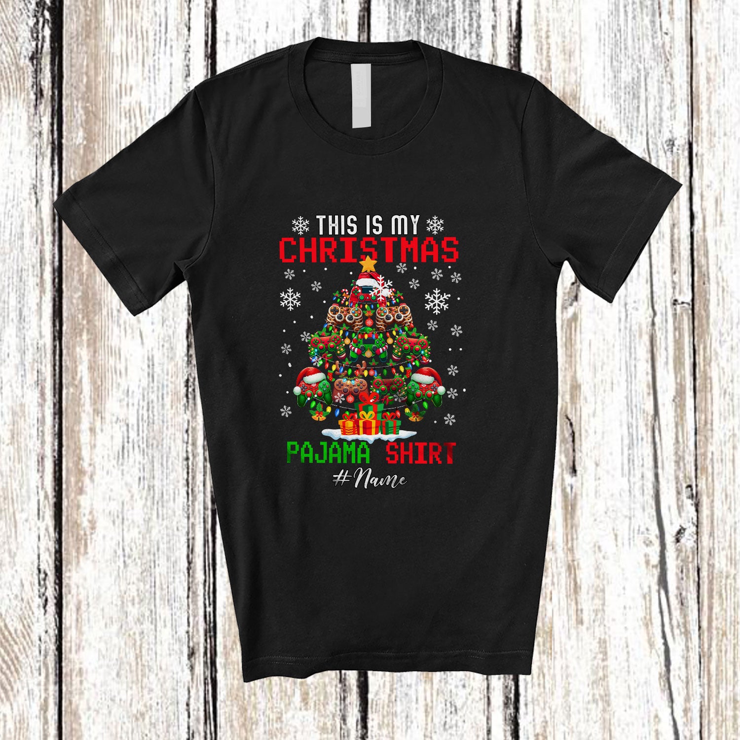 Personalized Custom Name My Christmas Pajama Shirt; Amusing X-mas Tree Games Controller; Gamer T-Shirt. This cotton t-shirt is a durable staple product with a classic fit. One of the most popular items, it has a relaxed style made for everyday and casual wear.