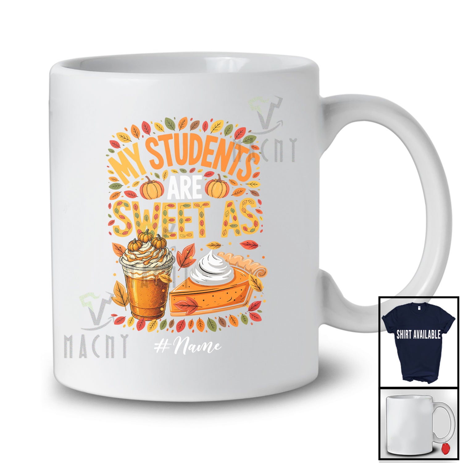 Personalized Custom Name My Students Are Sweet As Pie Pumpkin Spice; Lovely Thanksgiving Teacher T-Shirt. This cotton t-shirt is a durable staple product with a classic fit. One of the most popular items, it has a relaxed style made for everyday and casual wear.