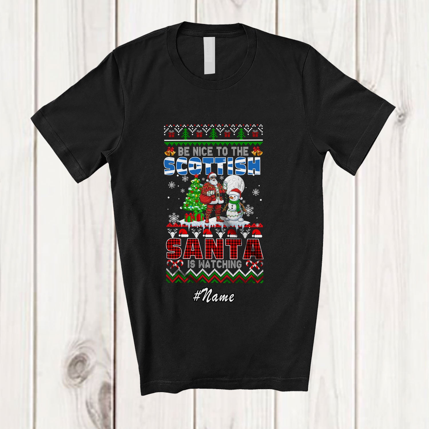 Personalized Custom Name Nice To The Scottish; Amazing Christmas Sweater Santa Snowman T-Shirt. This cotton t-shirt is a durable staple product with a classic fit. One of the most popular items, it has a relaxed style made for everyday and casual wear.