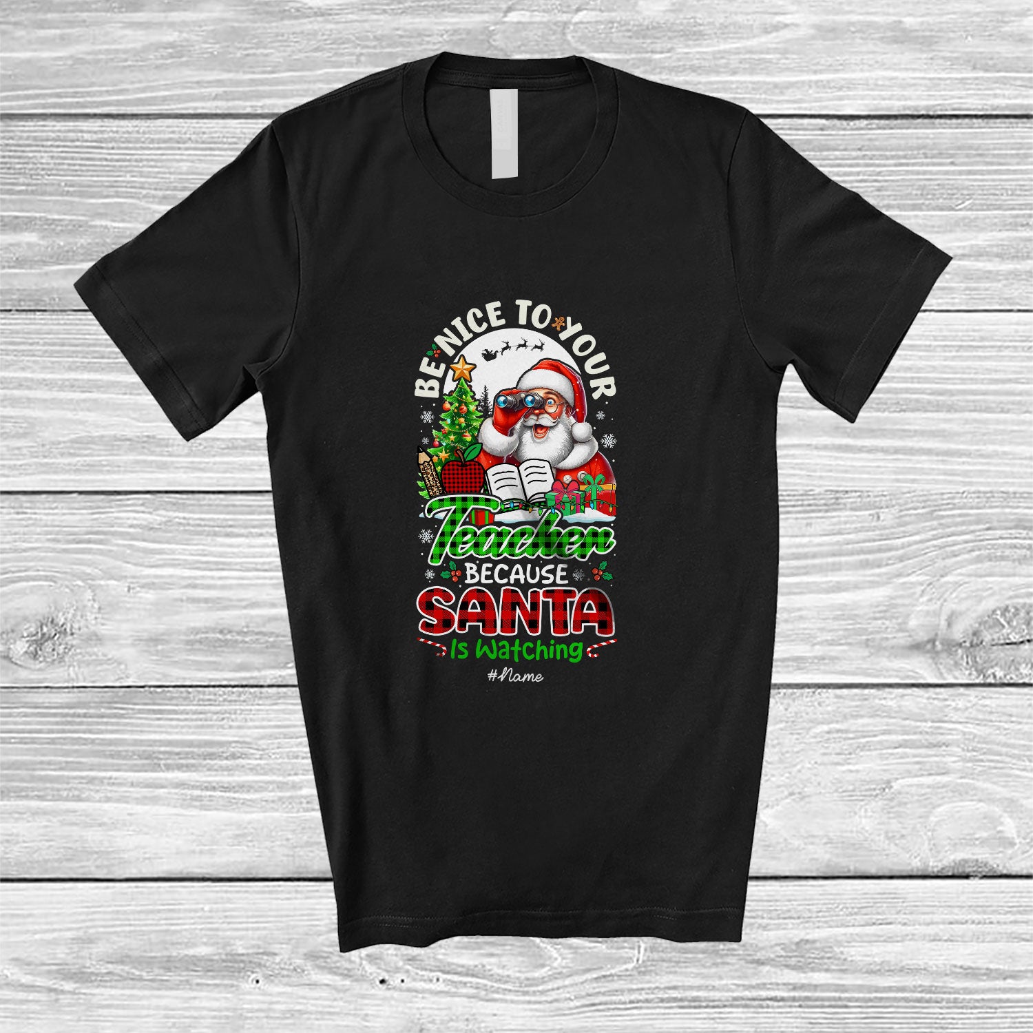 Personalized Custom Name Nice To Your Teacher Santa; Awesome Christmas Tree Moon Plaid T-Shirt