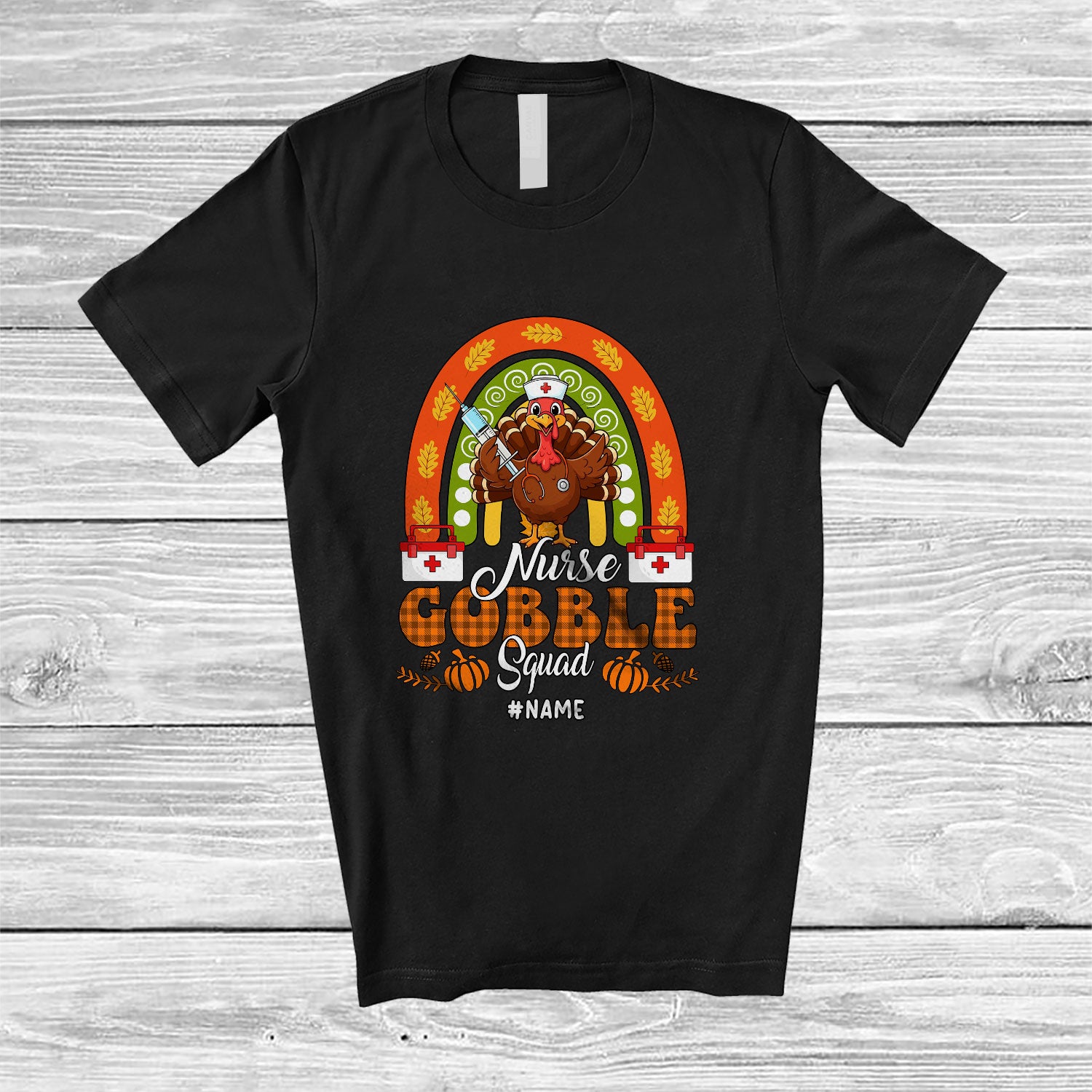 Personalized Custom Name Nurse Gobble Squad; Proud Thanksgiving Plaid Rainbow Turkey T-Shirt. This cotton t-shirt is a durable staple product with a classic fit. One of the most popular items, it has a relaxed style made for everyday and casual wear.