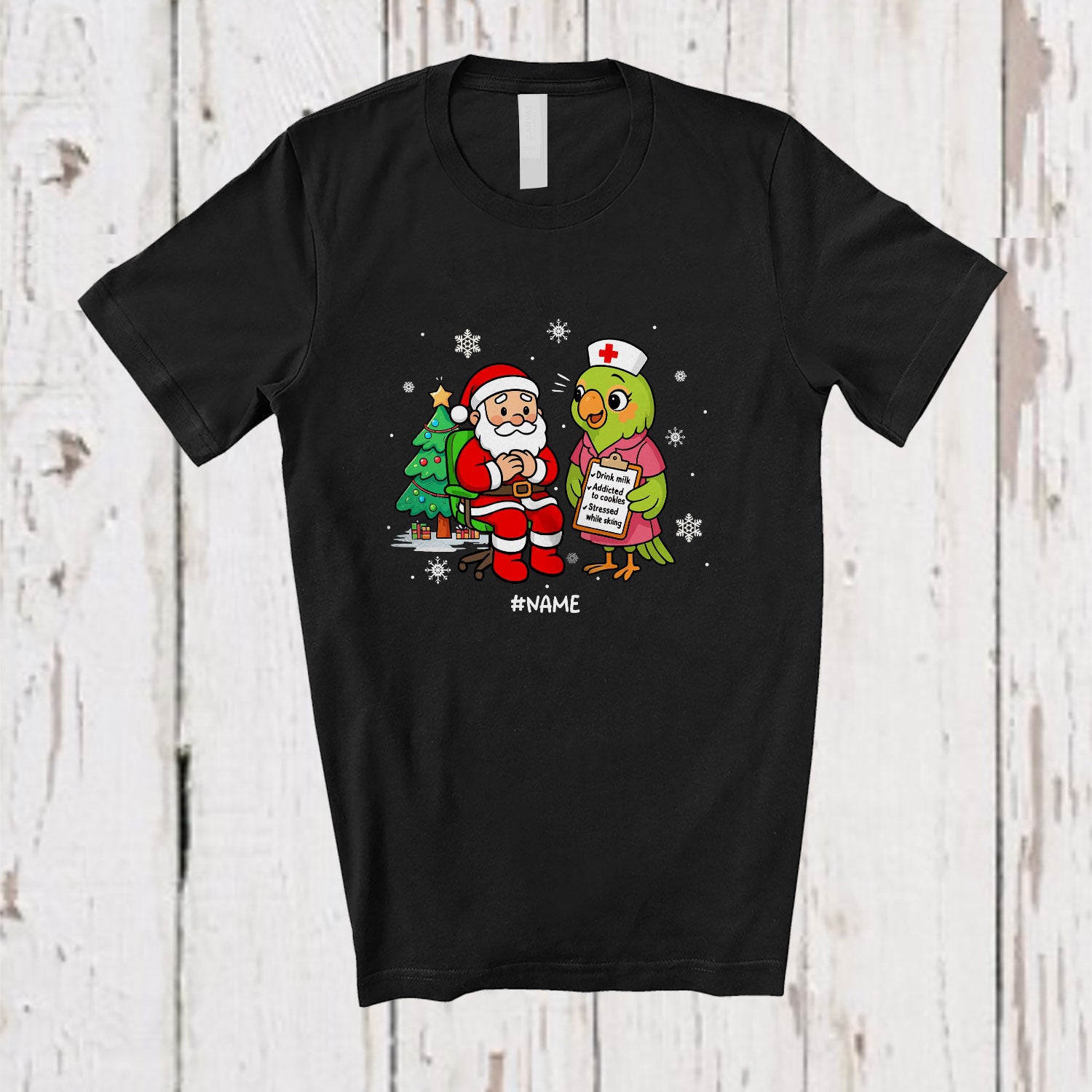 • Personalized Custom Name Nurse Parrot With Santa; Humorous Christmas Tree Parrot Nursing T-Shirt. This cotton t-shirt is a durable staple product with a classic fit. One of the most popular items, it has a relaxed style made for everyday and casual wear.