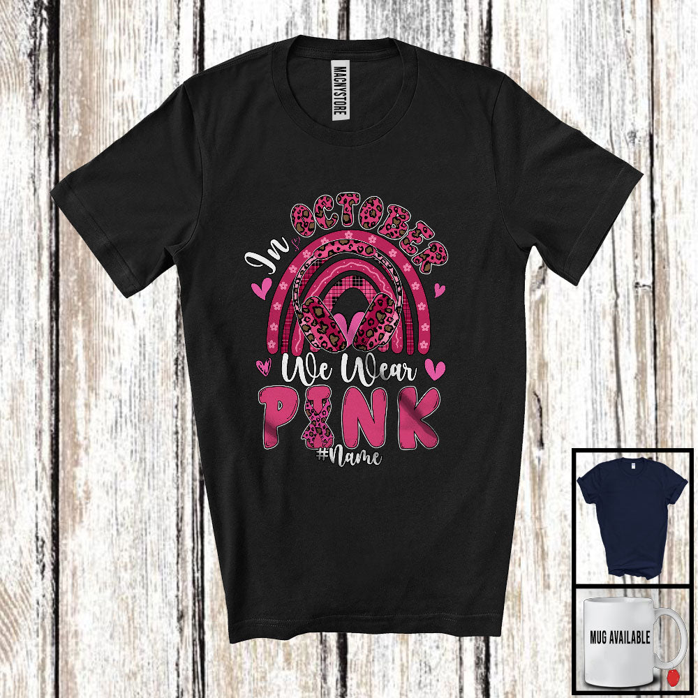 Personalized Custom Name October We Wear Pink; Lovely Breast Cancer Ribbon; Dispatcher Rainbow T-Shirt. This cotton t-shirt is a durable staple product with a classic fit. One of the most popular items, it has a relaxed style made for everyday and casual wear.