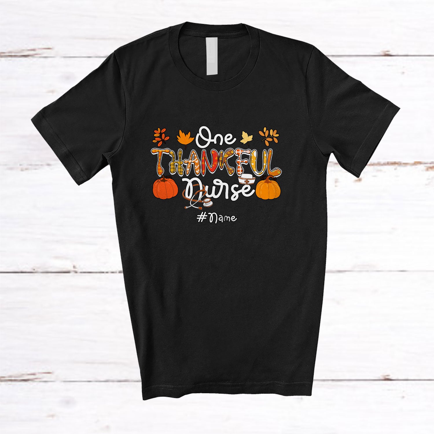 Personalized Custom Name One Thankful Nurse; Proud Thanksgiving Jobs Turkey T-Shirt. This cotton t-shirt is a durable staple product with a classic fit. One of the most popular items, it has a relaxed style made for everyday and casual wear.