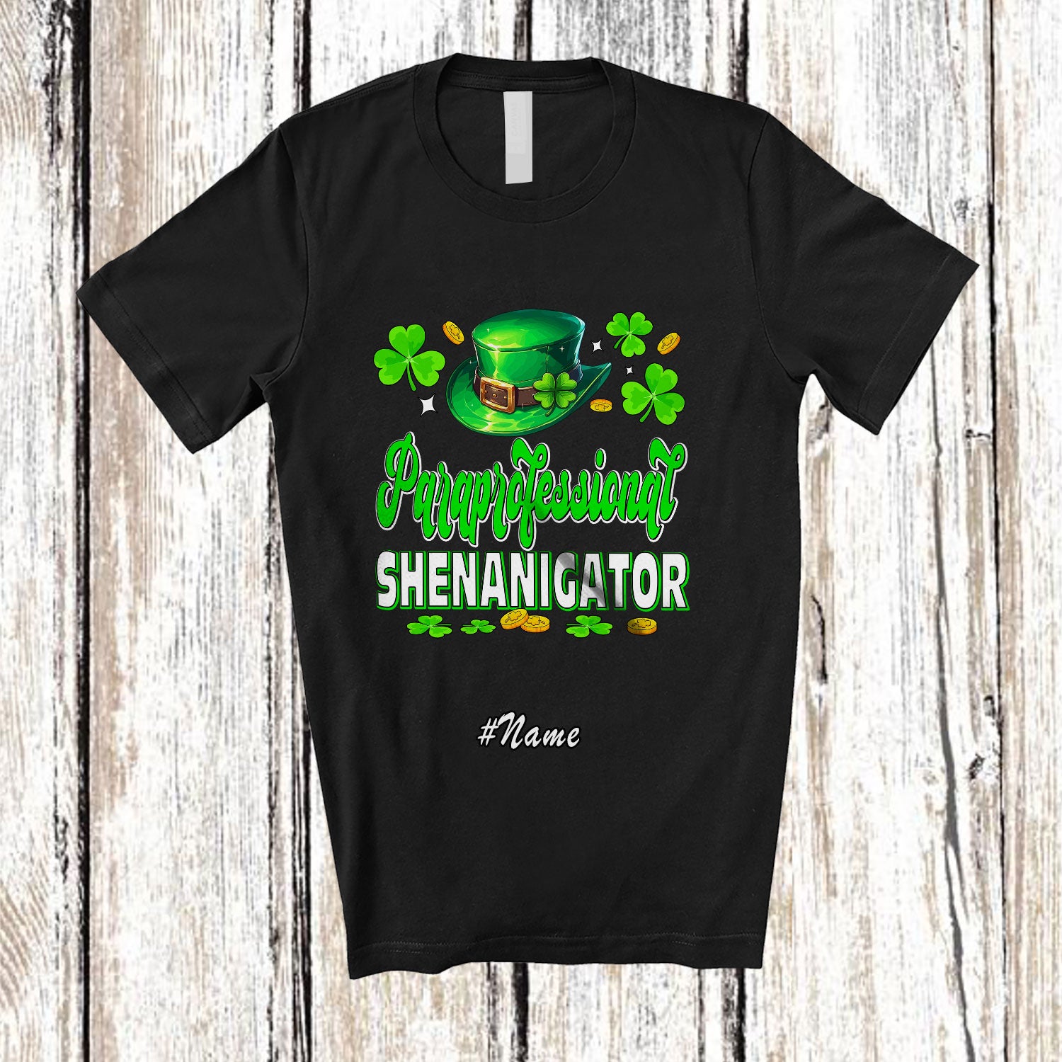 Personalized Custom Name Paraprofessional Shenanigator; Joyful St. Patrick's Day Shamrock Shenanigans T-Shirt. This cotton t-shirt is a durable staple product with a classic fit. One of the most popular items, it has a relaxed style made for everyday and casual wear.