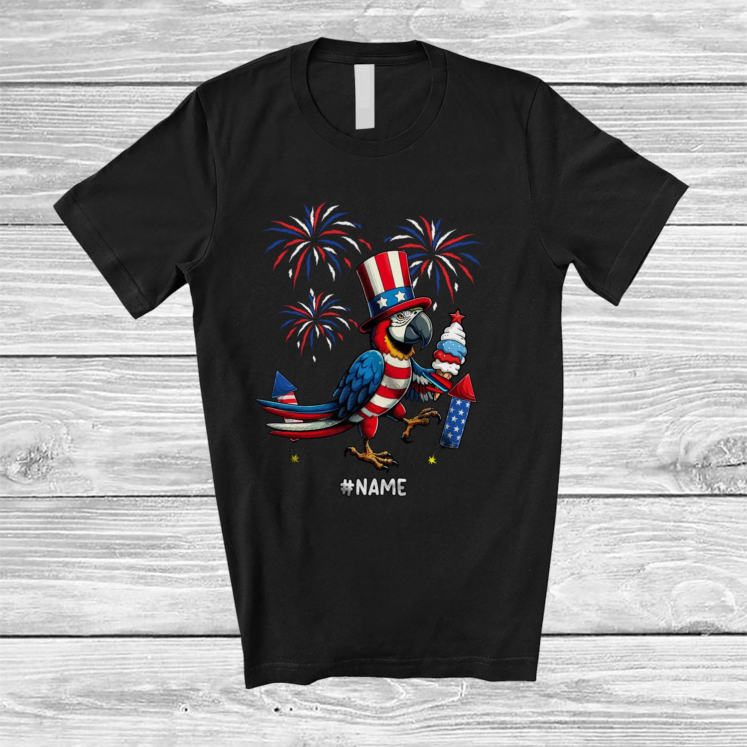 • Personalized Custom Name Parrot Ice Cream; Joyful 4th Of July American Flag; Patriotic T-Shirt. This cotton t-shirt is a durable staple product with a classic fit. One of the most popular items, it has a relaxed style made for everyday and casual wear.