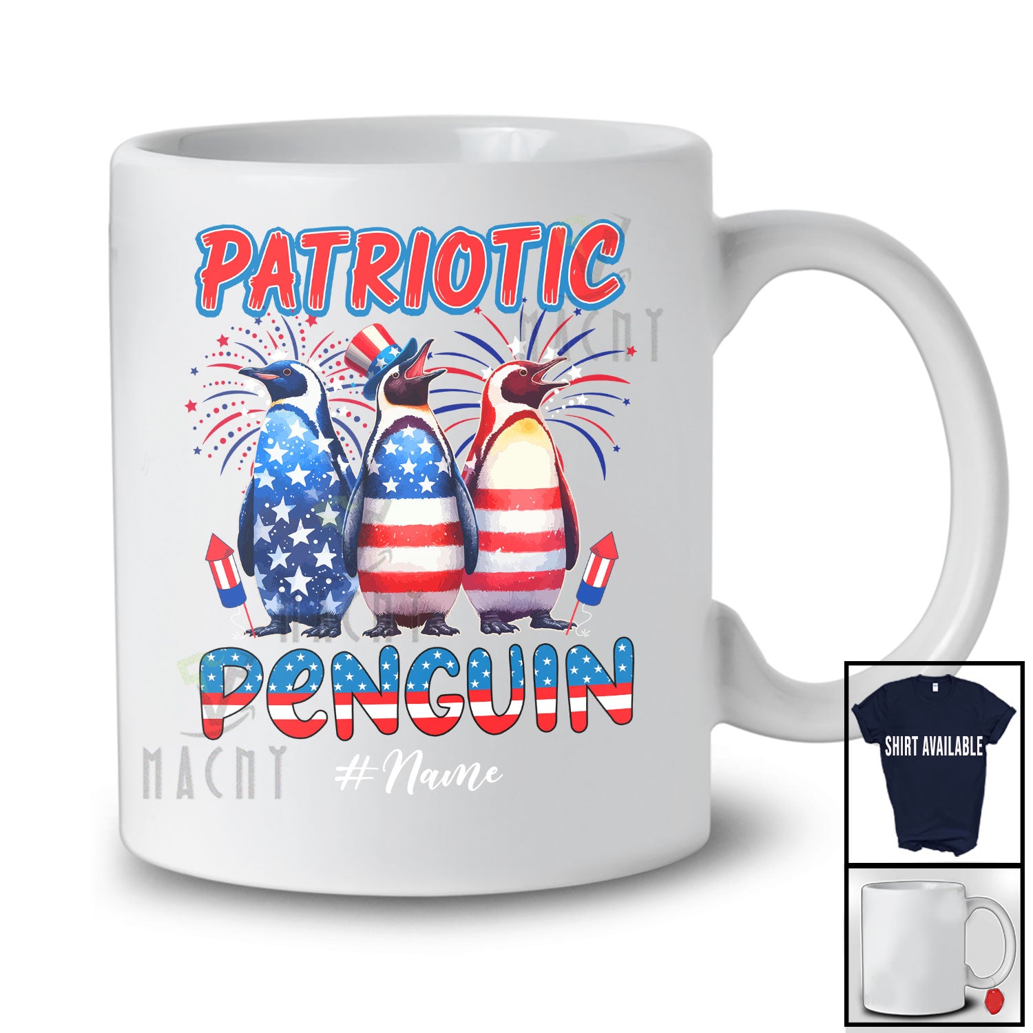 Personalized Custom Name Patriotic Penguin; Joyful 4th Of July Three Penguins Bird Lover T-Shirt. This cotton t-shirt is a durable staple product with a classic fit. One of the most popular items, it has a relaxed style made for everyday and casual wear.