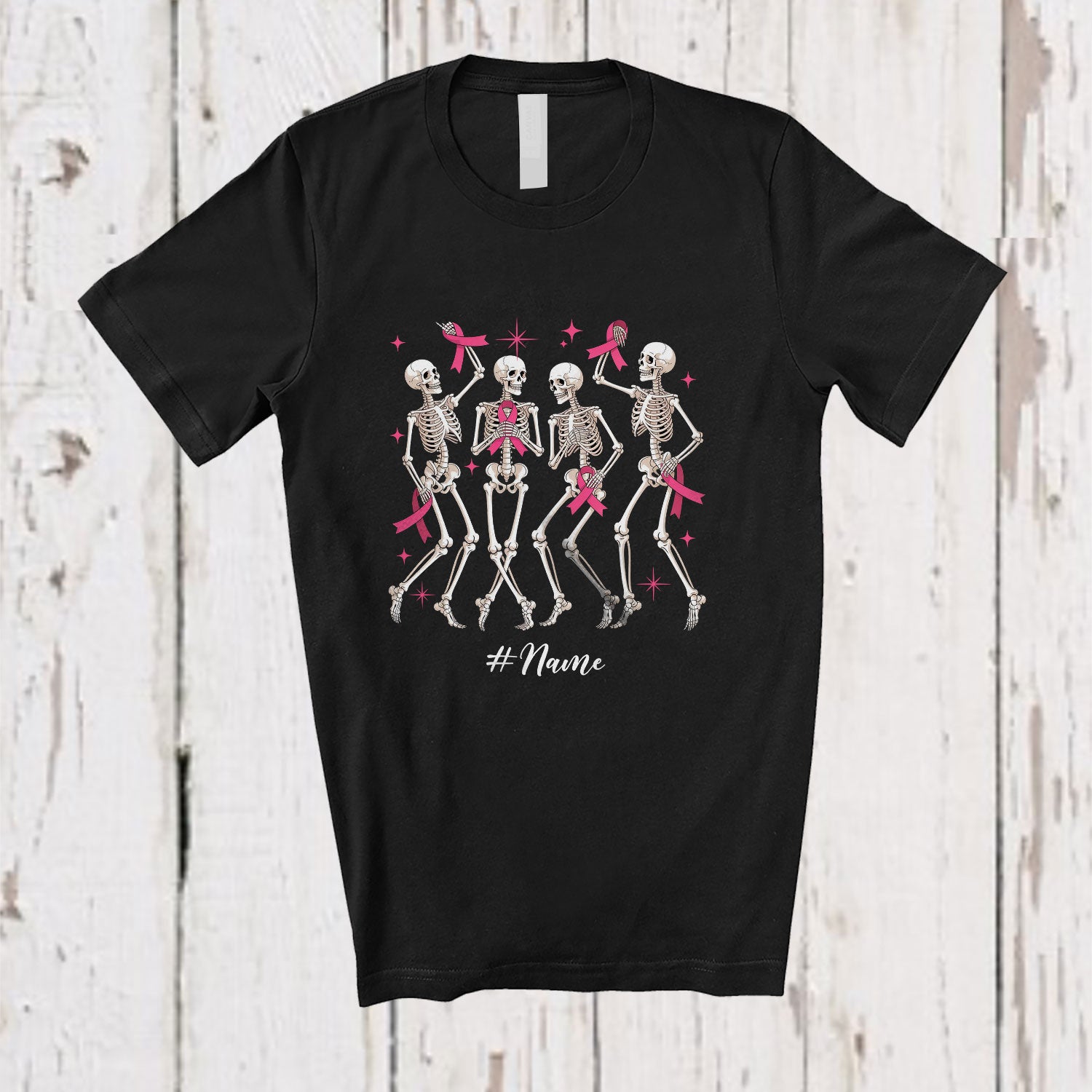 Personalized Custom Name Pink Ribbon Skeleton Dancing; Amusing Halloween Breast Cancer T-Shirt. This cotton t-shirt is a durable staple product with a classic fit. One of the most popular items, it has a relaxed style made for everyday and casual wear.
