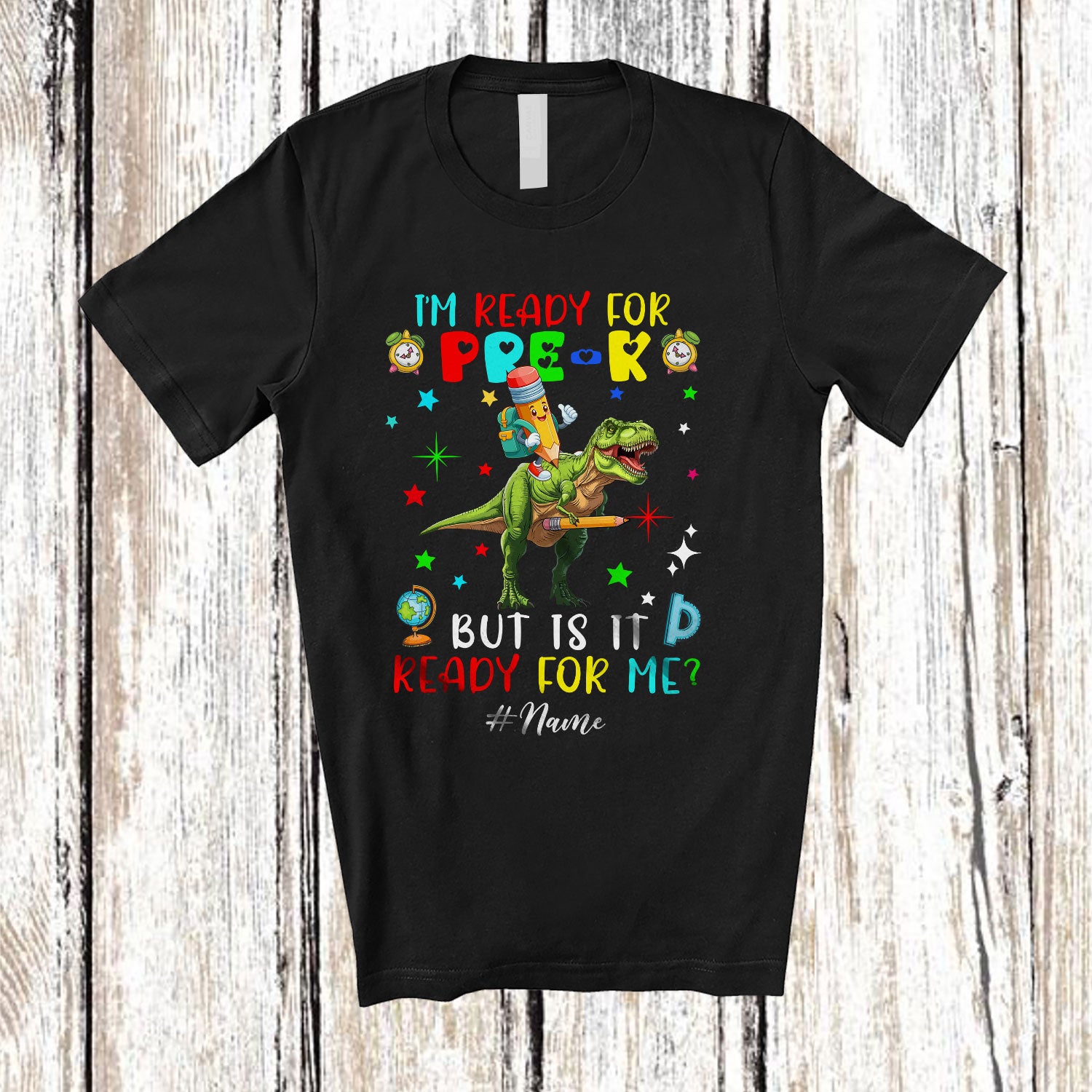 Personalized Custom Name Ready For Pre-K; Amusing First Day Of School Pencil Riding T-Rex T-Shirt