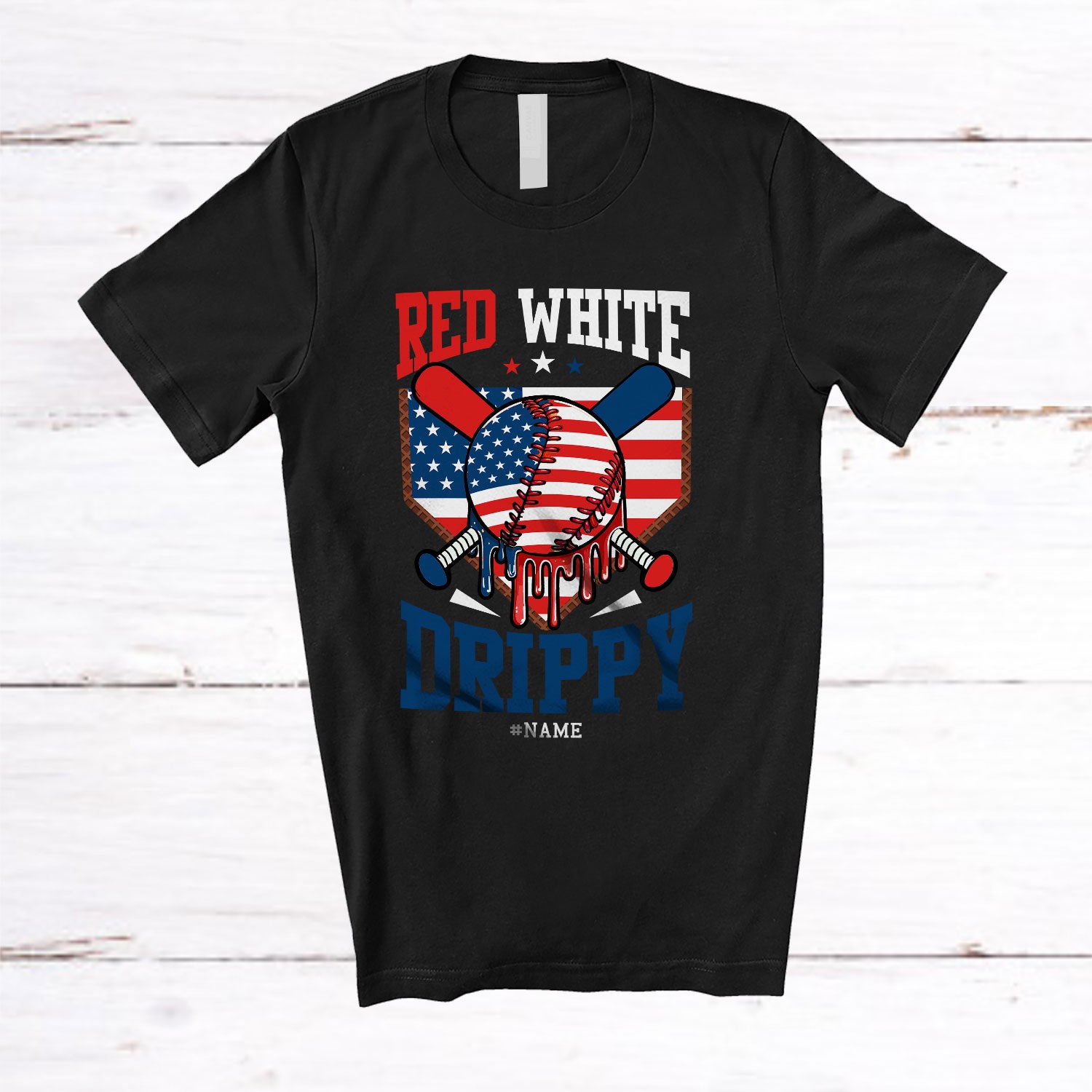 • Personalized Custom Name Red White and Drippy; Joyful 4th Of July Baseball Ice Cream T-Shirt. This cotton t-shirt is a durable staple product with a classic fit. One of the most popular items, it has a relaxed style made for everyday and casual wear.
