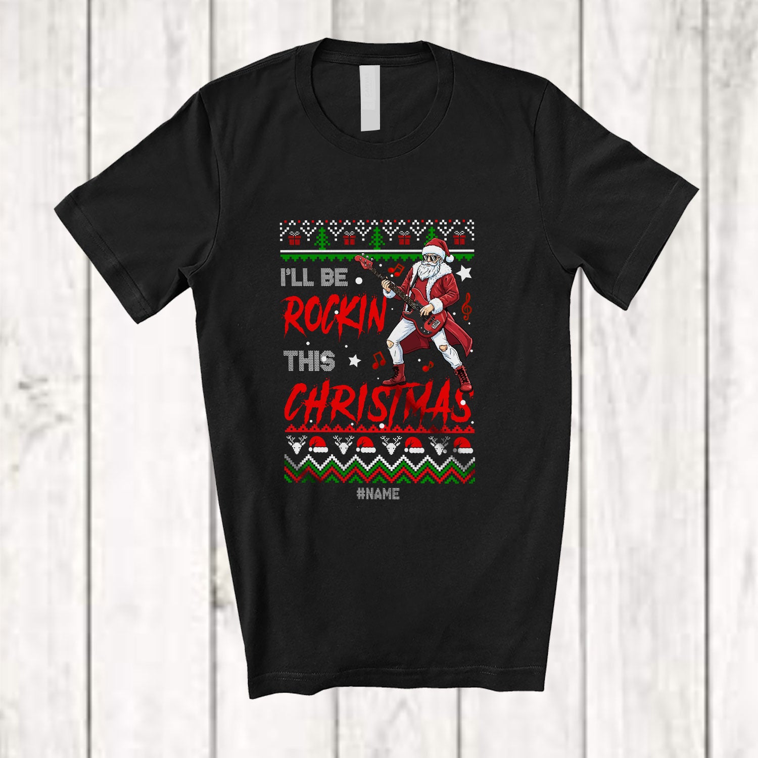 Personalized Custom Name Rockin This Christmas; Amusing Sweater Santa Bass Guitar Player T-Shirt. This cotton t-shirt is a durable staple product with a classic fit. One of the most popular items, it has a relaxed style made for everyday and casual wear.