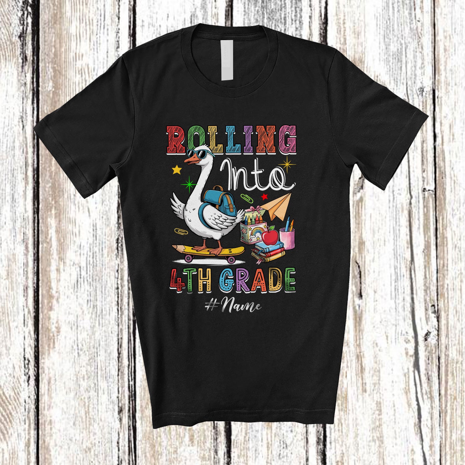 Personalized Custom Name Rolling Into 4th Grade; Humorous First Day Of School Goose Skating T-Shirt. This cotton t-shirt is a durable staple product with a classic fit. One of the most popular items, it has a relaxed style made for everyday and casual wear.