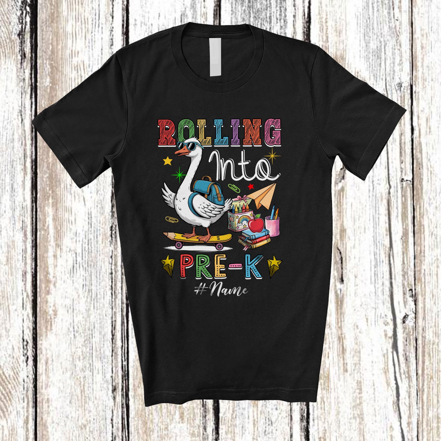 Personalized Custom Name Rolling Into Pre-K; Humorous First Day Of School Goose Skating T-Shirt