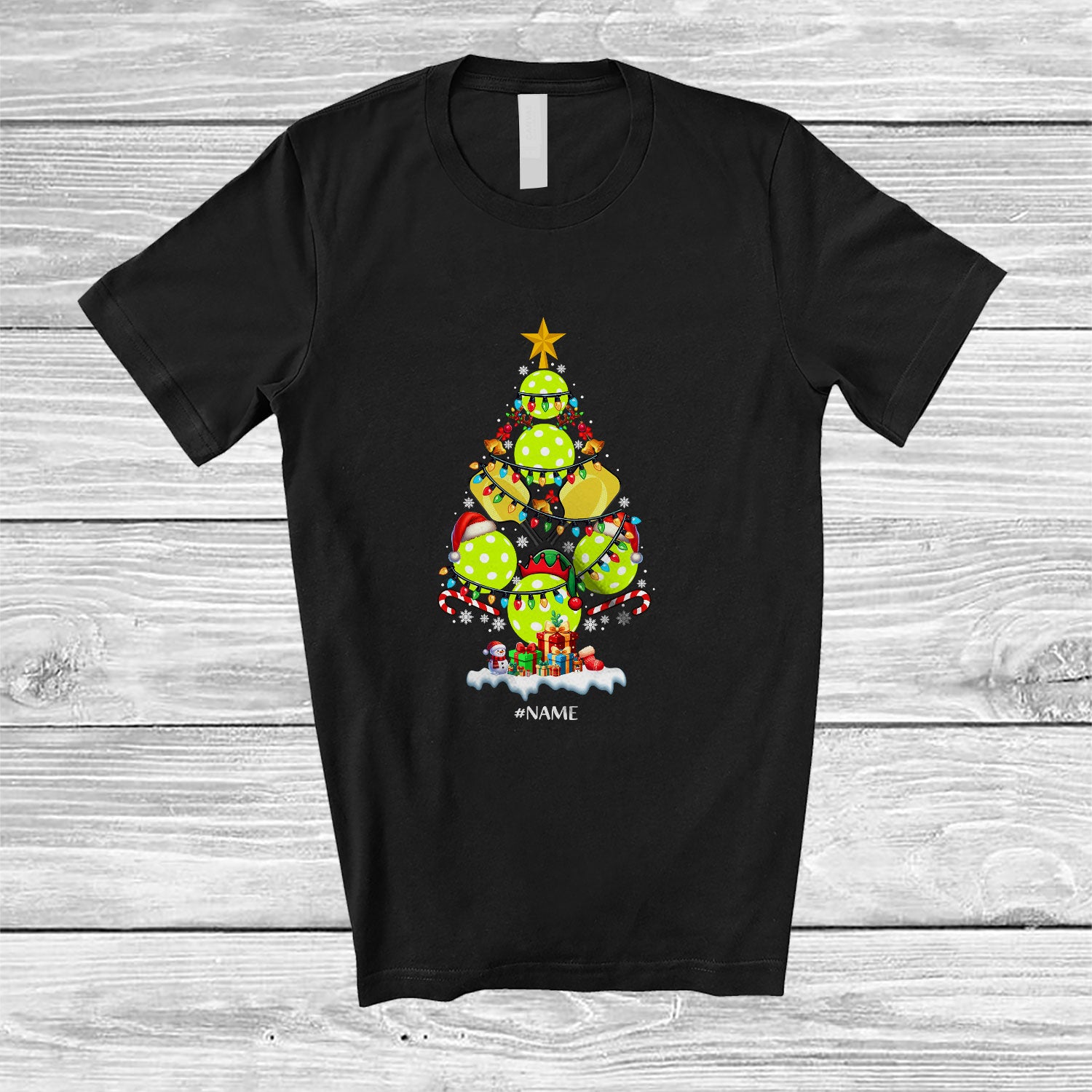 Personalized Custom Name Santa Elf Pickleballs Christmas Tree; Wonderful X-mas Lights Sport Player T-Shirt. This cotton t-shirt is a durable staple product with a classic fit. One of the most popular items, it has a relaxed style made for everyday and casual wear.