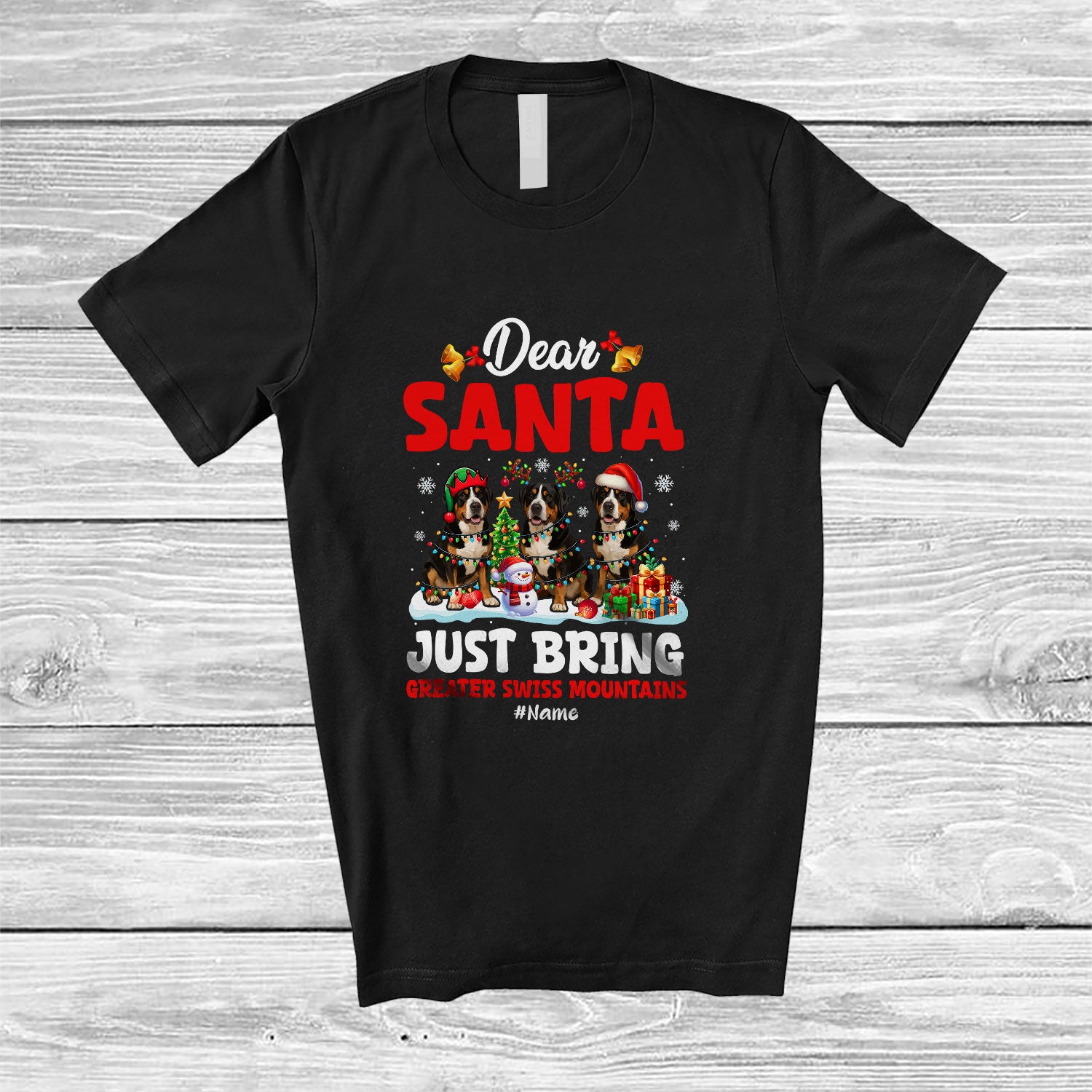 Personalized Custom Name Santa Just Bring Greater Swiss Mountains; Lovely Christmas Tree Family T-Shirt. This cotton t-shirt is a durable staple product with a classic fit. One of the most popular items, it has a relaxed style made for everyday and casual wear.