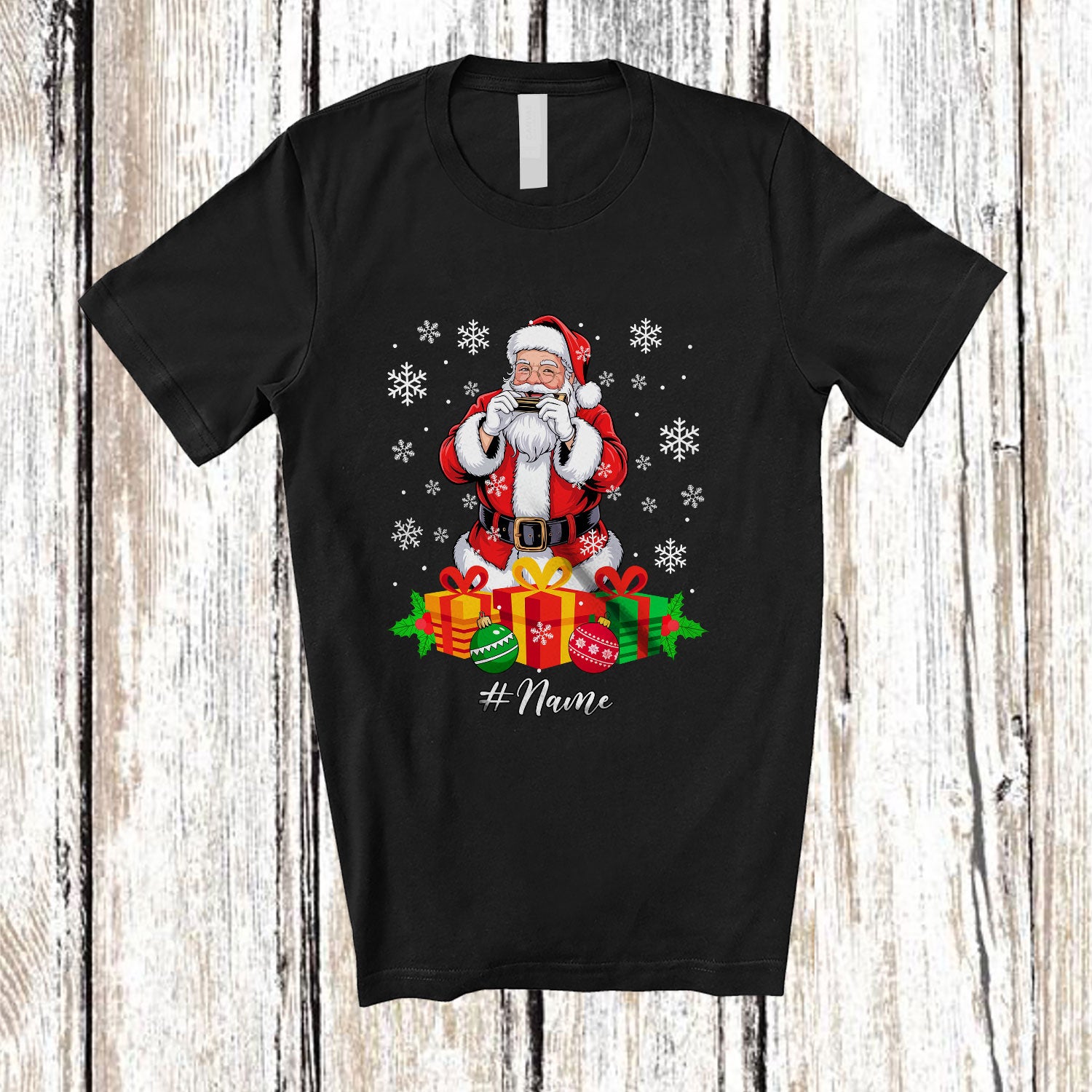 Personalized Custom Name Santa Playing Harmonica; Amusing Christmas Musical Instruments Player T-Shirt