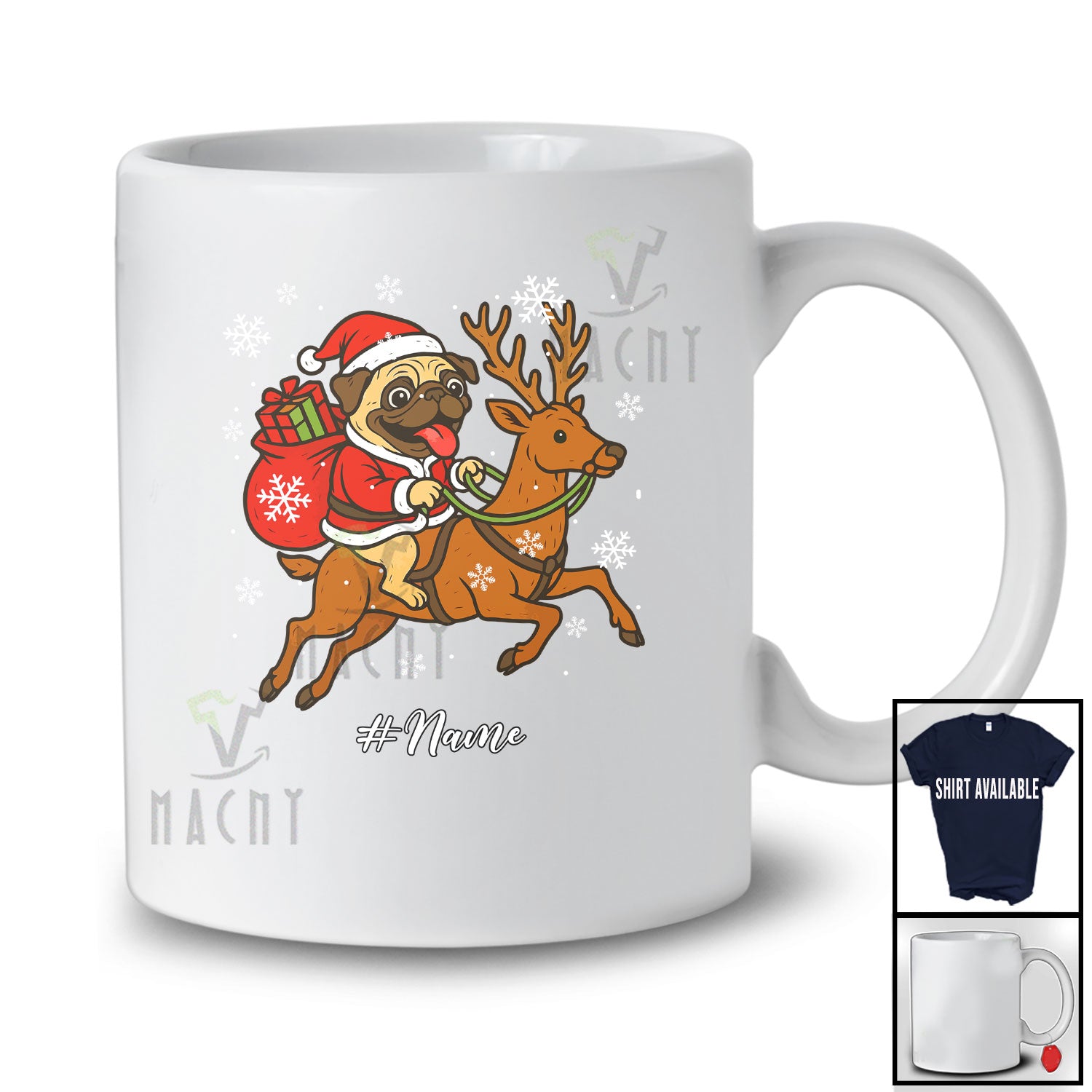Personalized Custom Name Santa Pug Riding Reindeer; Amazing Christmas Pug Owner Lover T-Shirt. This cotton t-shirt is a durable staple product with a classic fit. One of the most popular items, it has a relaxed style made for everyday and casual wear.