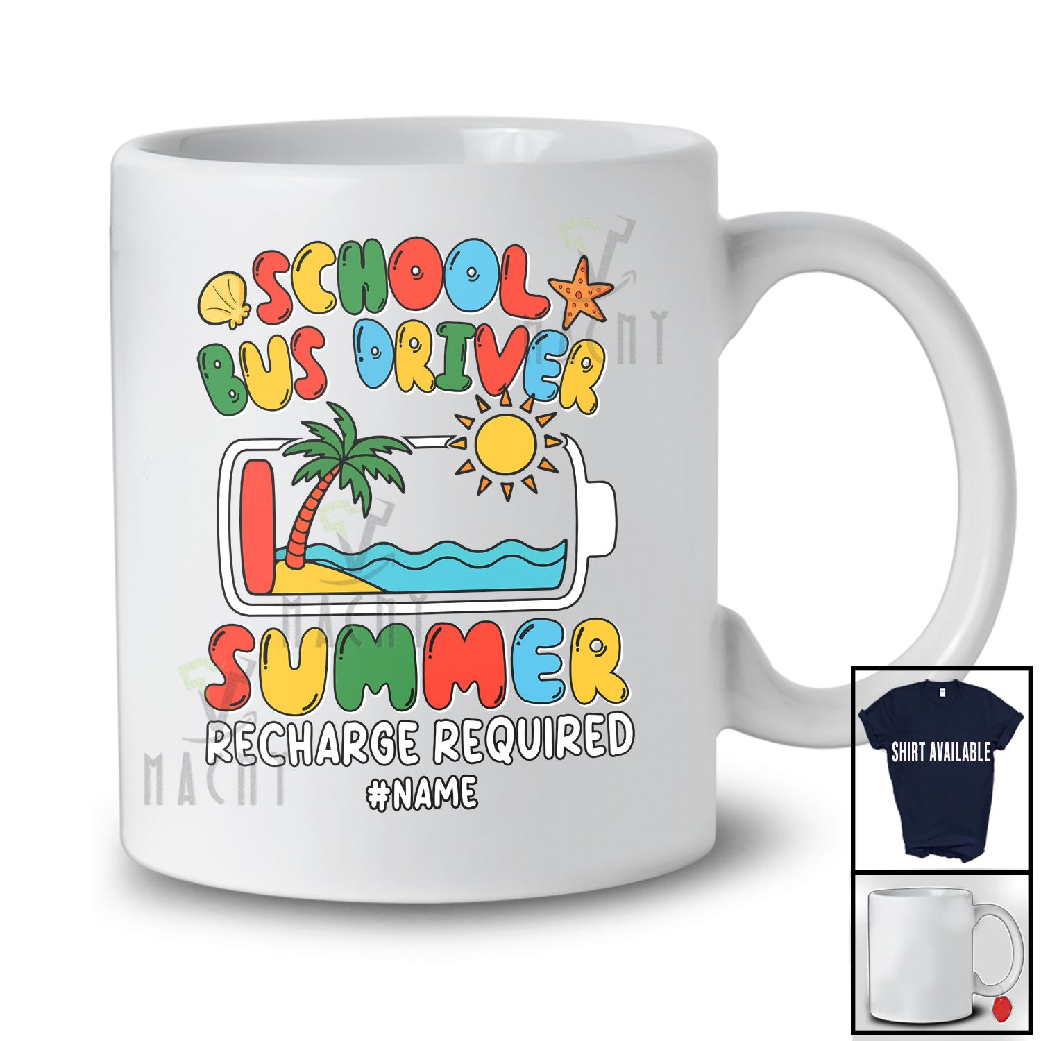 • Personalized Custom Name School Bus Driver Summer Recharge; Proud Last Day Of School Battery T-Shirt. This cotton t-shirt is a durable staple product with a classic fit. One of the most popular items, it has a relaxed style made for everyday and casual wear.