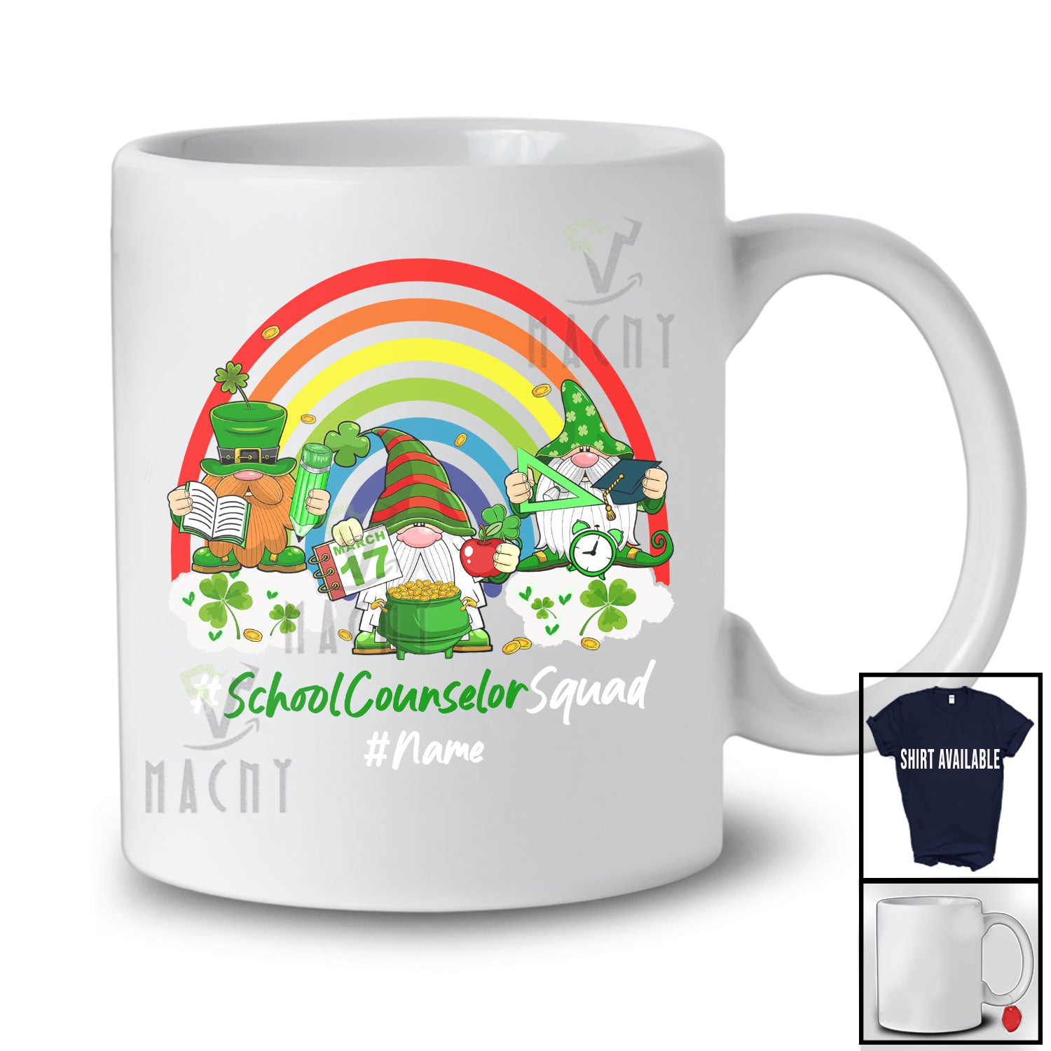 Personalized Custom Name School Counselor Squad; Joyful St. Patrick's Day Three Gnomes; Rainbow T-Shirt. This cotton t-shirt is a durable staple product with a classic fit. One of the most popular items, it has a relaxed style made for everyday and casual wear.