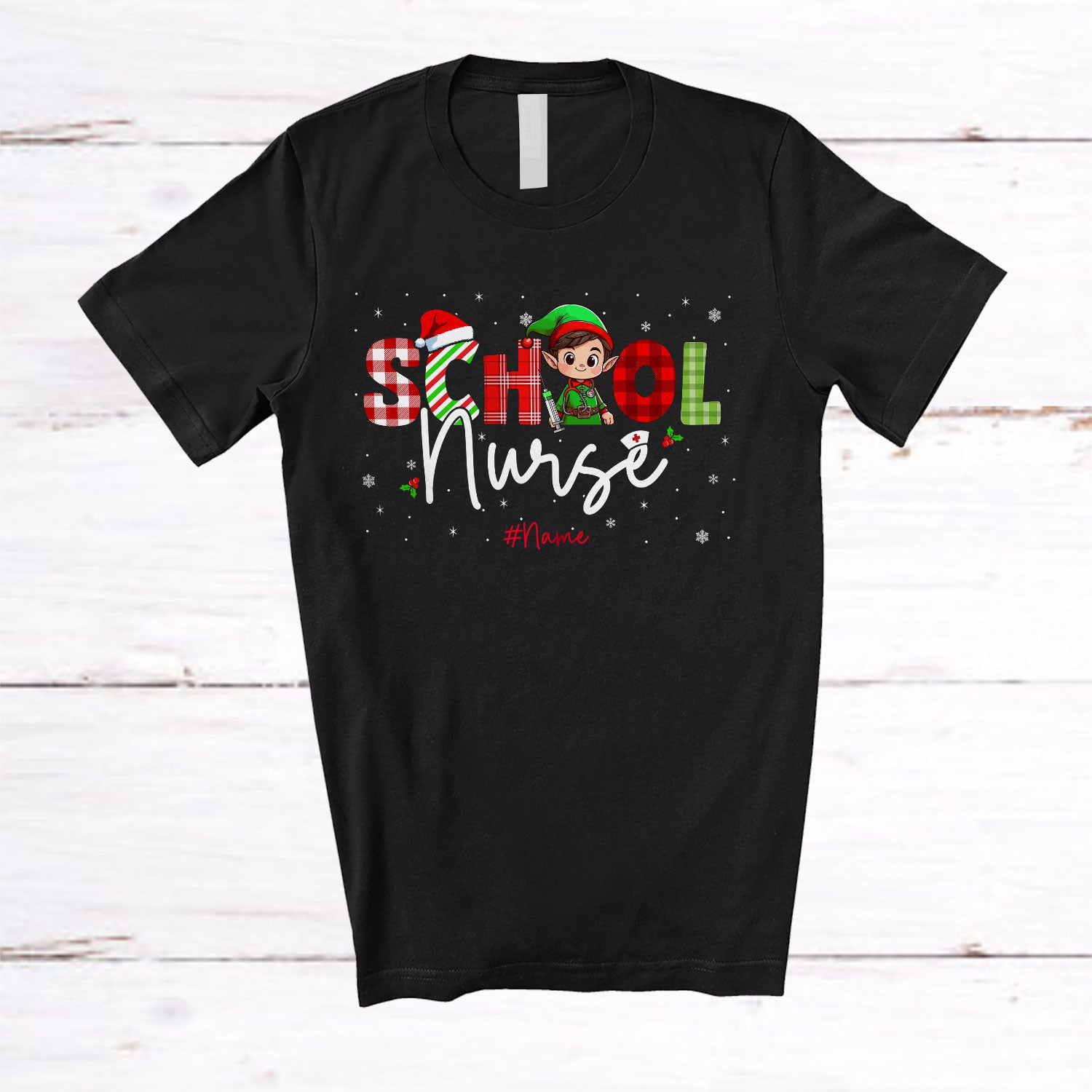 • Personalized Custom Name School Nurse; Amusing Christmas Plaid Elf; School Nurse Squad T-Shirt. This cotton t-shirt is a durable staple product with a classic fit. One of the most popular items, it has a relaxed style made for everyday and casual wear.