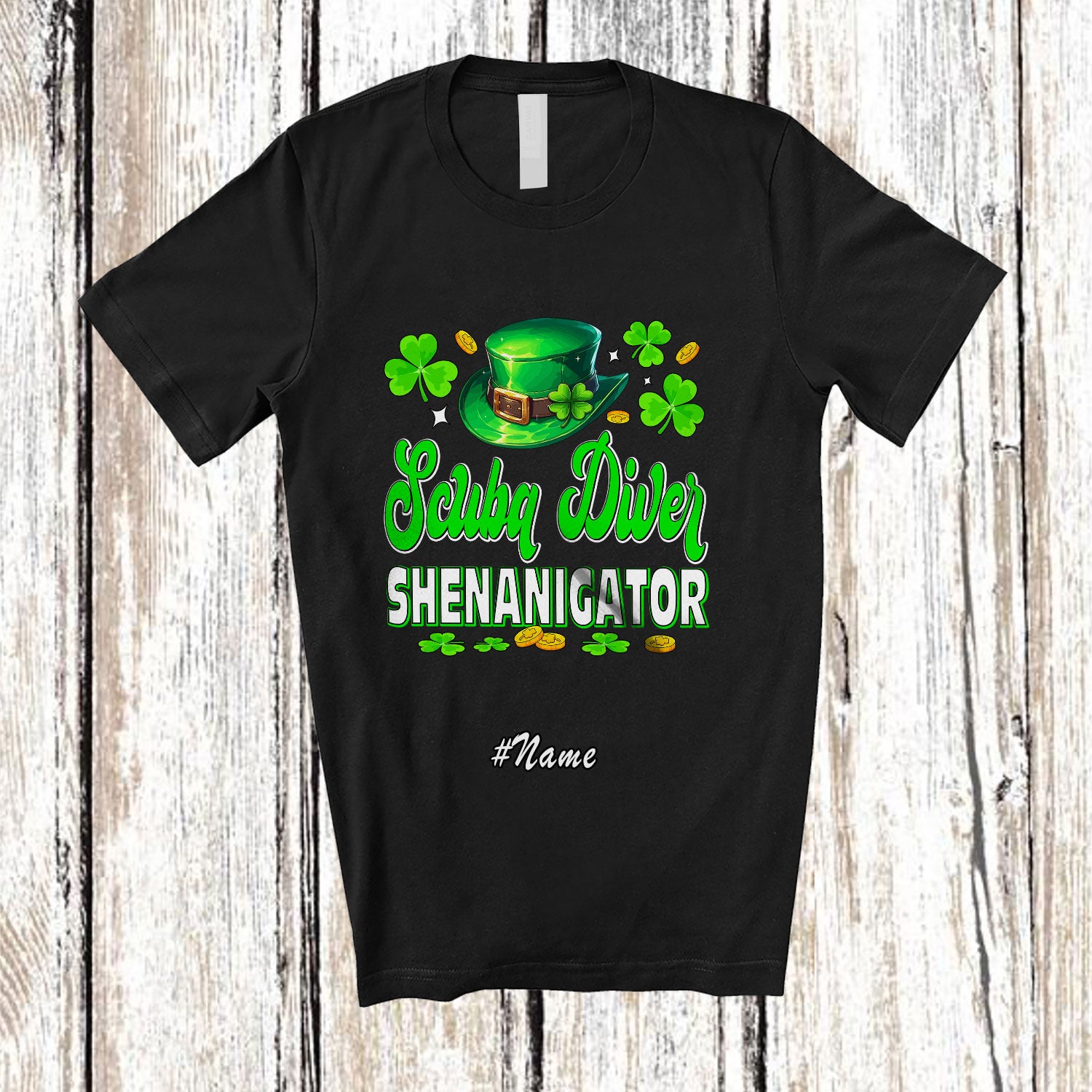 Personalized Custom Name Scuba Diver Shenanigator; Joyful St. Patrick's Day Shamrock Shenanigans T-Shirt. This cotton t-shirt is a durable staple product with a classic fit. One of the most popular items, it has a relaxed style made for everyday and casual wear.