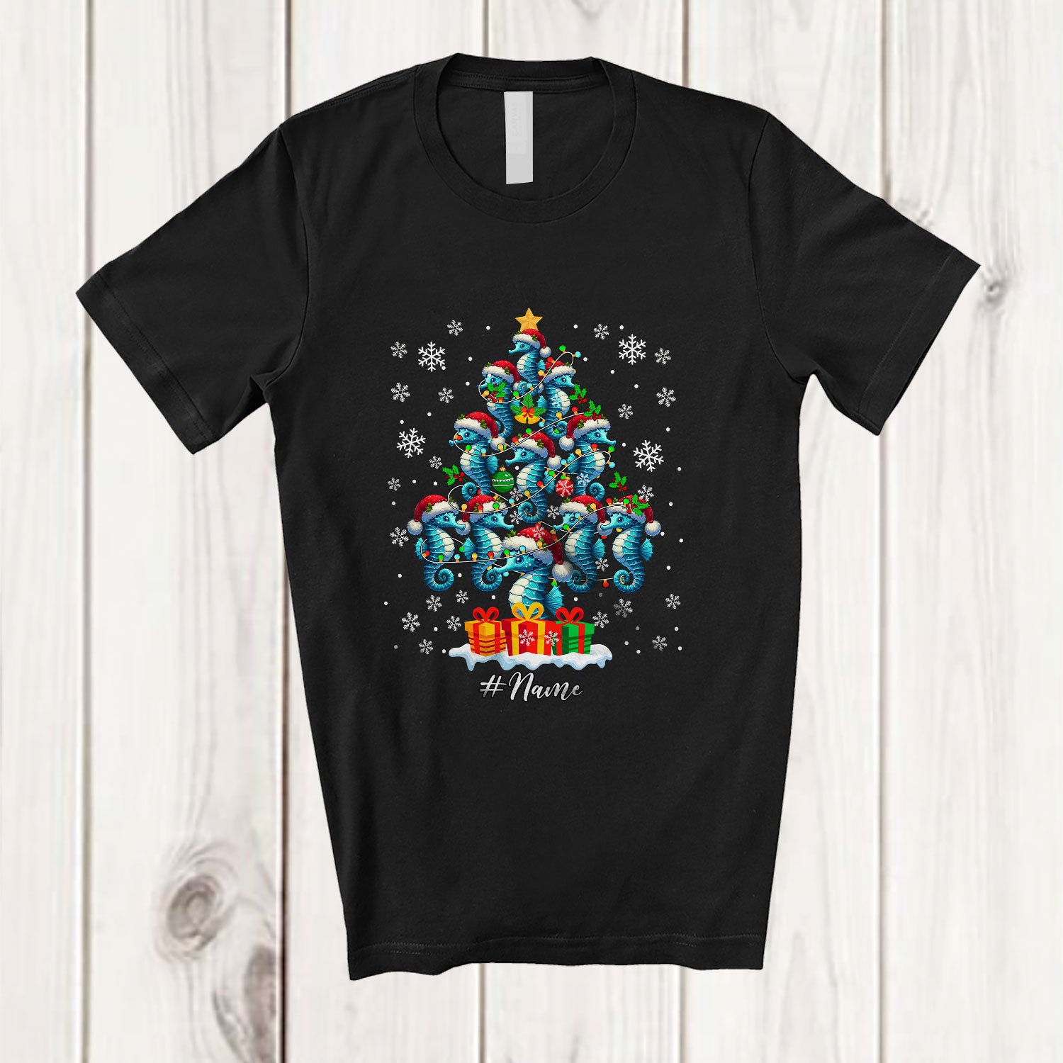Personalized Custom Name Seahorse Santa As Christmas Tree; Lovely X-mas Lights Family T-Shirt