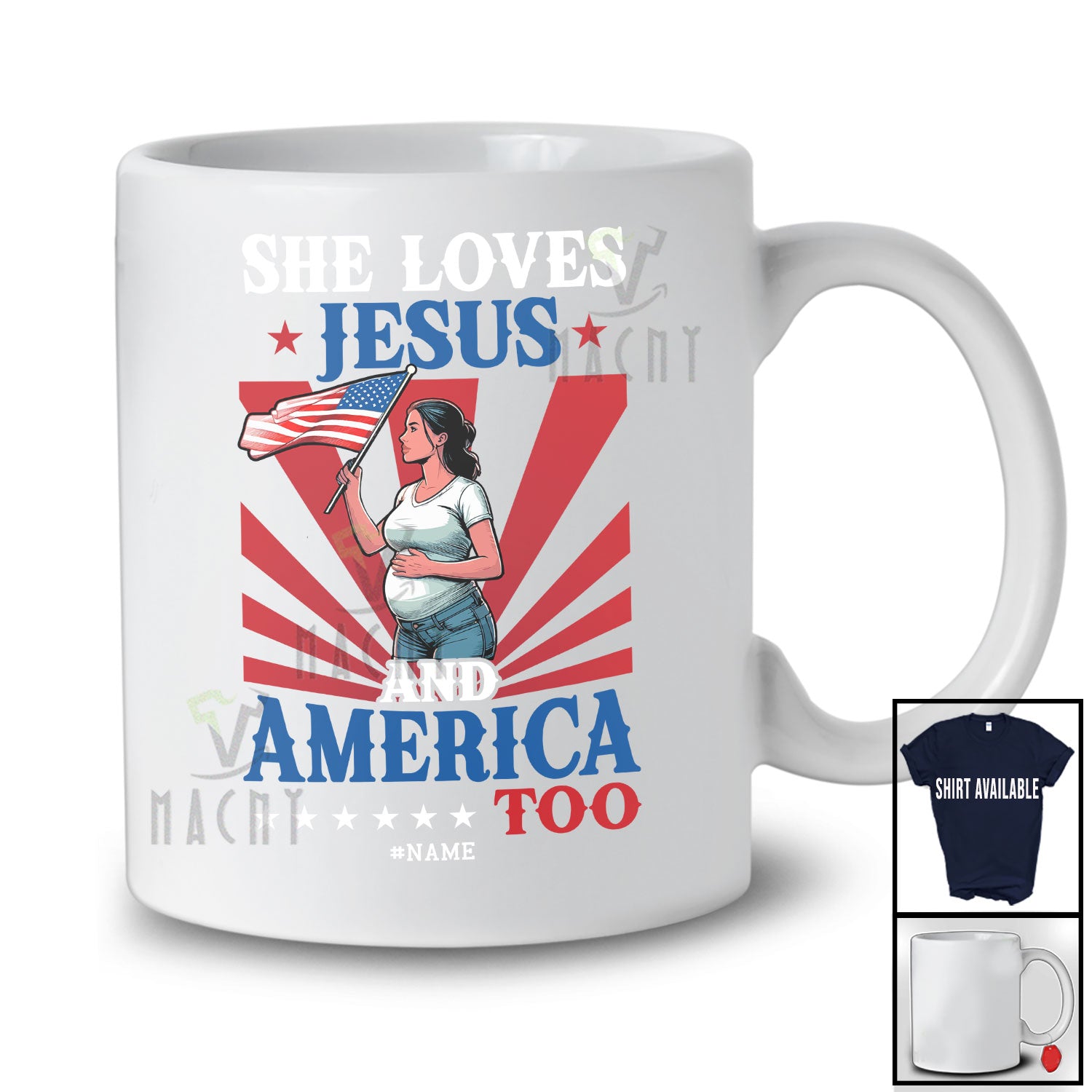 Personalized Custom Name She Loves Jesus America Too; Proud 4th Of July Pregnancy; Patriotic T-Shirt