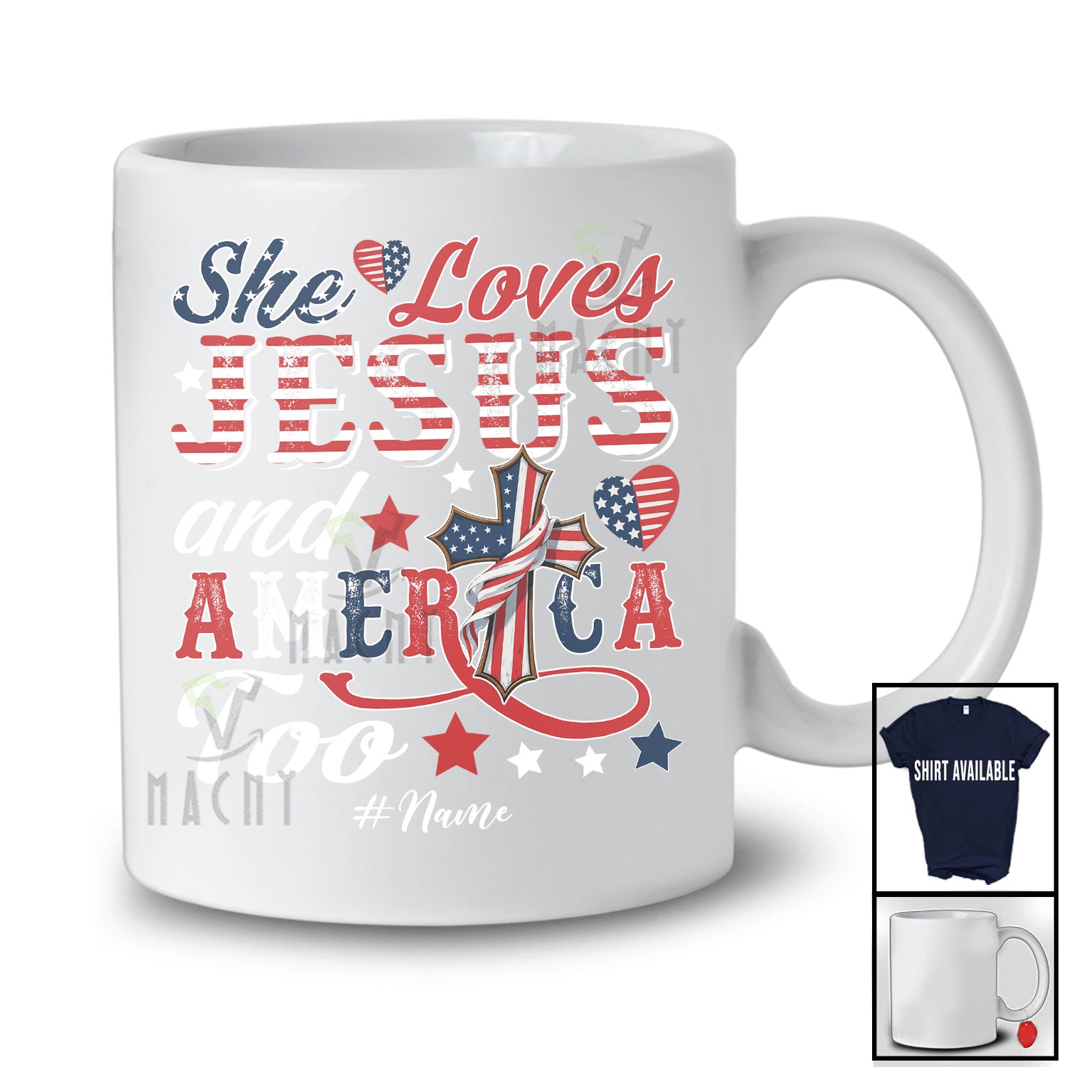 Personalized Custom Name She Loves Jesus and America Too; Proud 4th of July Patriotic Cross T-Shirt