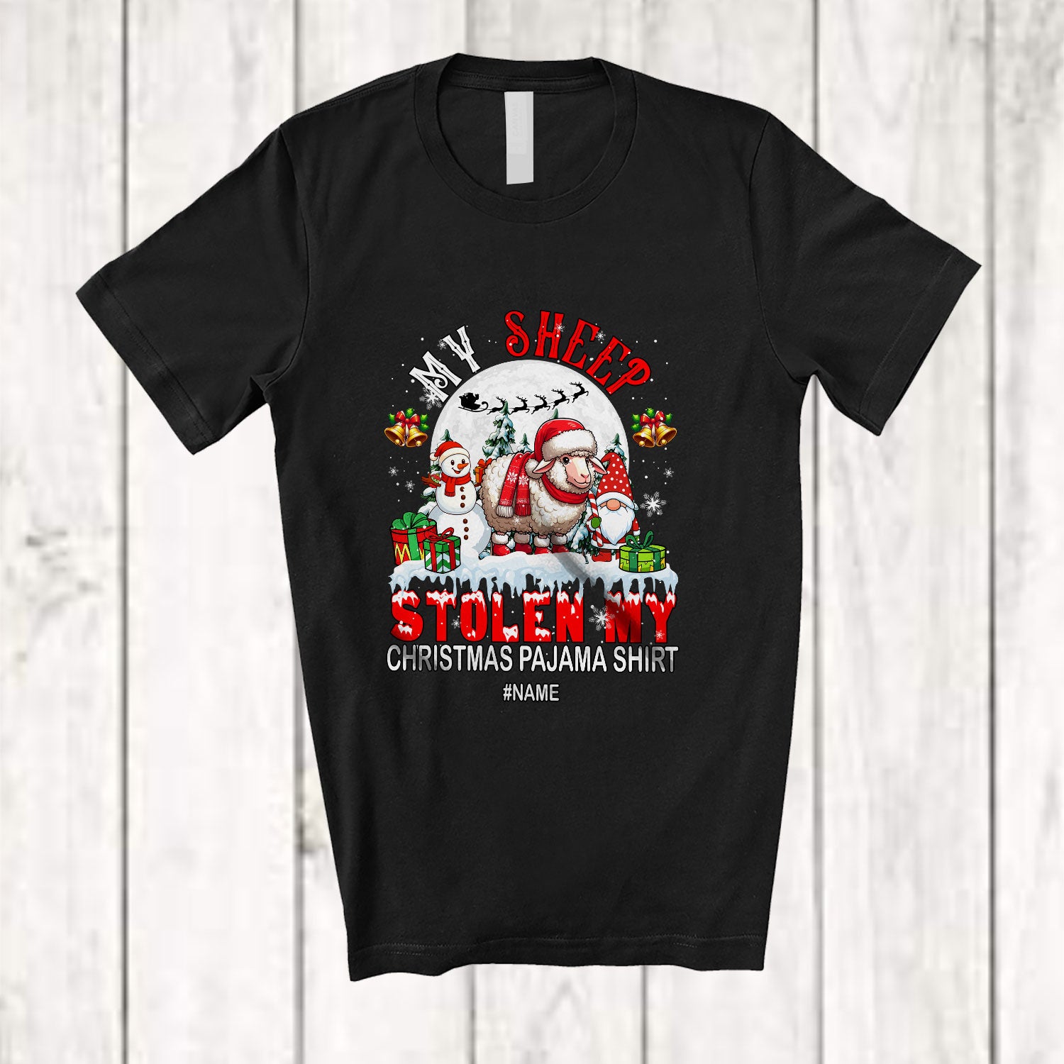 Personalized Custom Name Sheep Stolen My Christmas Pajama Shirt; Joyful Moon Santa Gnome T-Shirt