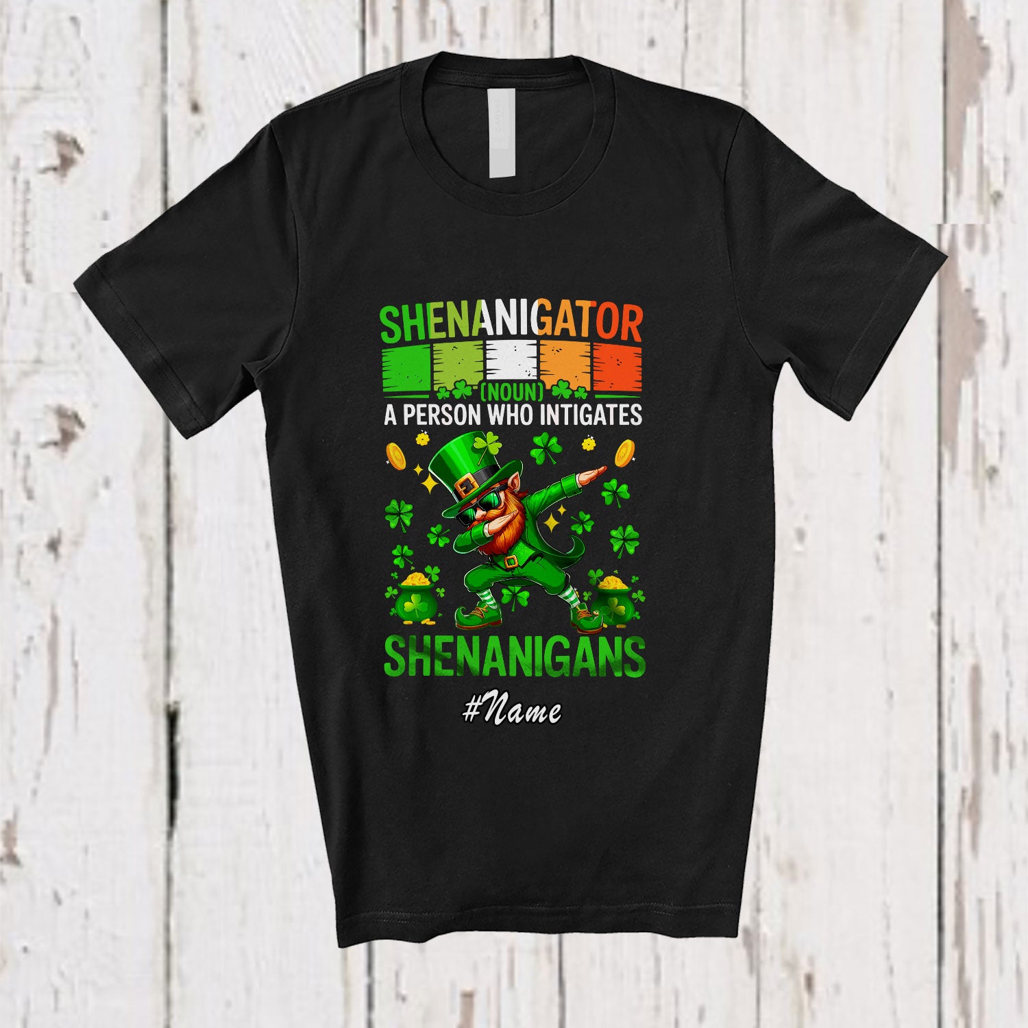 • Personalized Custom Name Shenanigator Definition; Joyful St. Patrick's Day Dabbing Leprechaun T-Shirt. This cotton t-shirt is a durable staple product with a classic fit. One of the most popular items, it has a relaxed style made for everyday and casual wear.