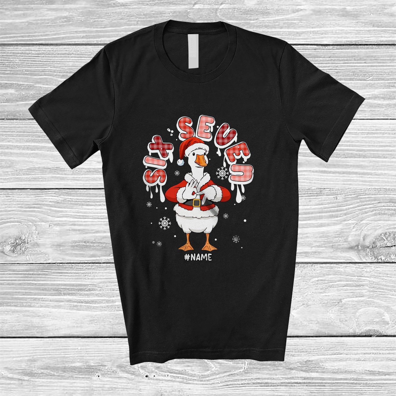 • Personalized Custom Name Six Seven; Amusing Christmas Santa Goose; X-mas Family Group T-Shirt. This cotton t-shirt is a durable staple product with a classic fit. One of the most popular items, it has a relaxed style made for everyday and casual wear.