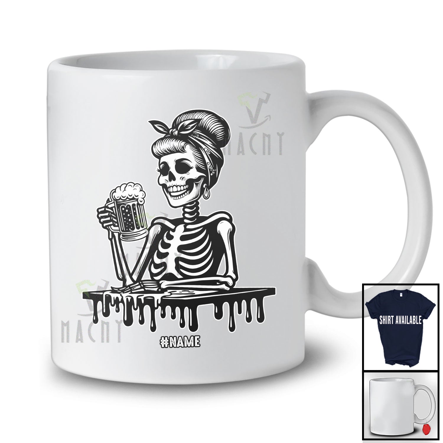 • Personalized Custom Name Skeleton Women Drinking Beer; Creepy Halloween Messy Bun Hair T-Shirt. This cotton t-shirt is a durable staple product with a classic fit. One of the most popular items, it has a relaxed style made for everyday and casual wear.