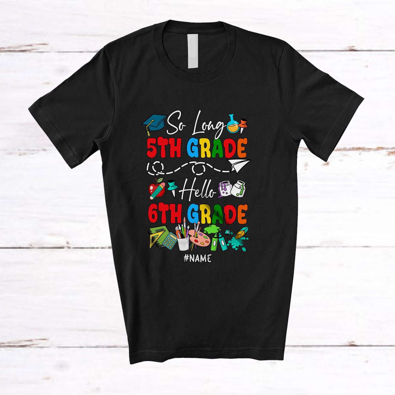 Personalized Custom Name So Long 5th Grade Hello 6th Grade; Lovely First Day Of School Teacher T-Shirt. This cotton t-shirt is a durable staple product with a classic fit. One of the most popular items, it has a relaxed style made for everyday and casual wear.
