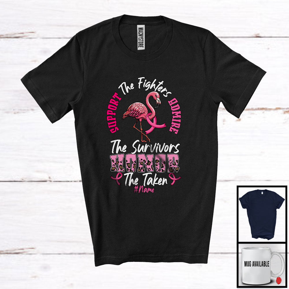 • Personalized Custom Name Support Admire Honor; Proud Breast Cancer Awareness Ribbon; Flamingo T-Shirt. This cotton t-shirt is a durable staple product with a classic fit. One of the most popular items, it has a relaxed style made for everyday and casual wear.