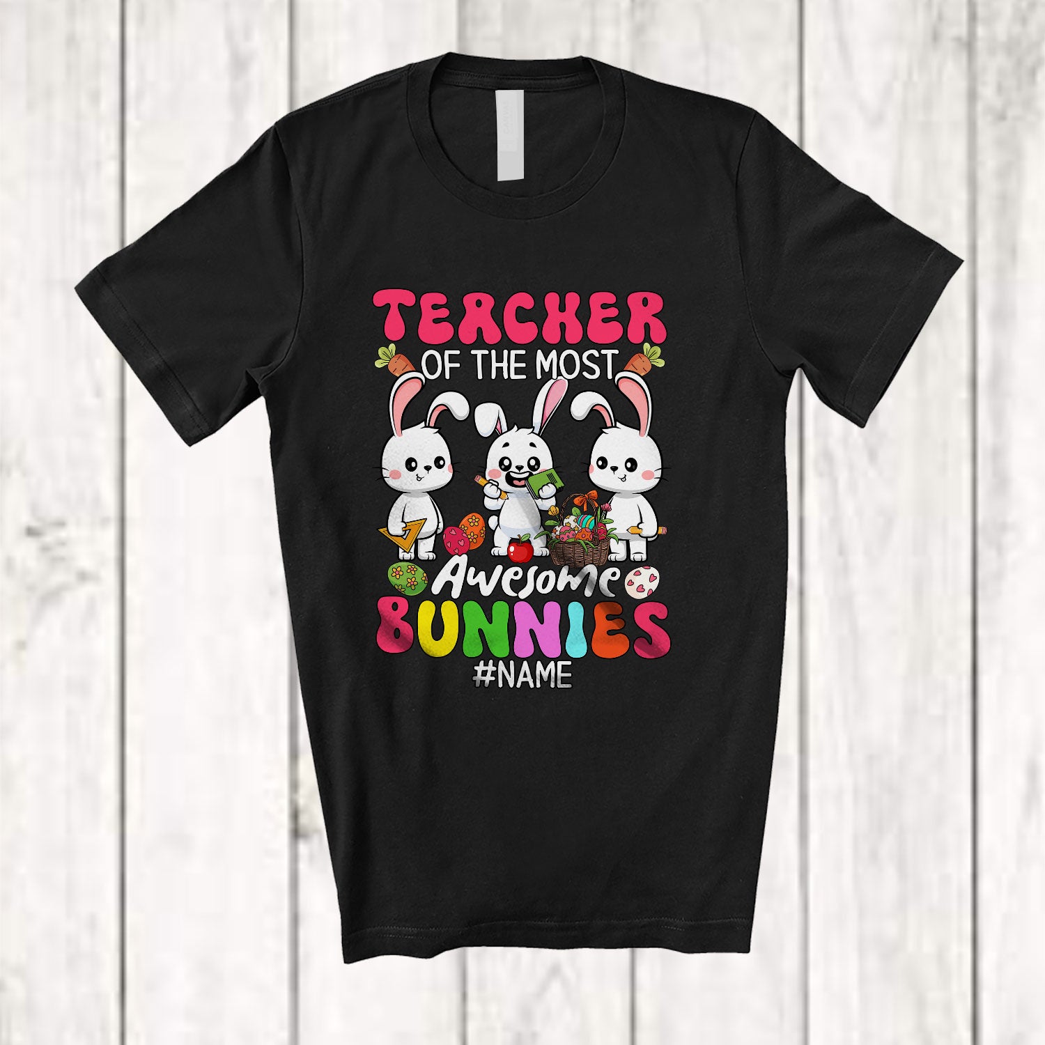 Personalized Custom Name Teacher Of The Most Awesome Bunnies; Lovely Easter 3 Bunnies Eggs T-Shirt. This cotton t-shirt is a durable staple product with a classic fit. One of the most popular items, it has a relaxed style made for everyday and casual wear.