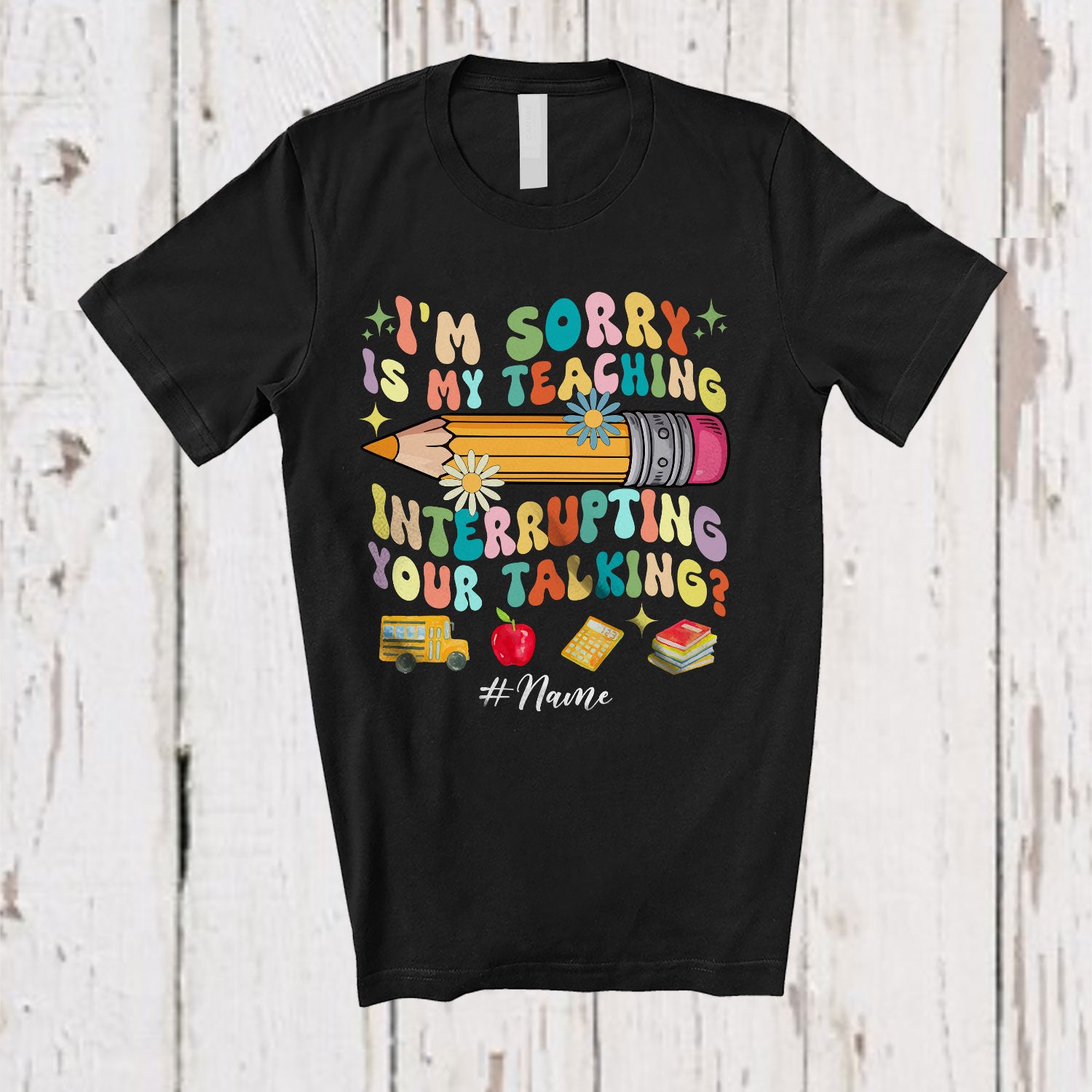 • Personalized Custom Name Teaching Interrupting Your Talking; Lovely Back To School Groovy Teacher T-Shirt. This cotton t-shirt is a durable staple product with a classic fit. One of the most popular items, it has a relaxed style made for everyday and casual wear.