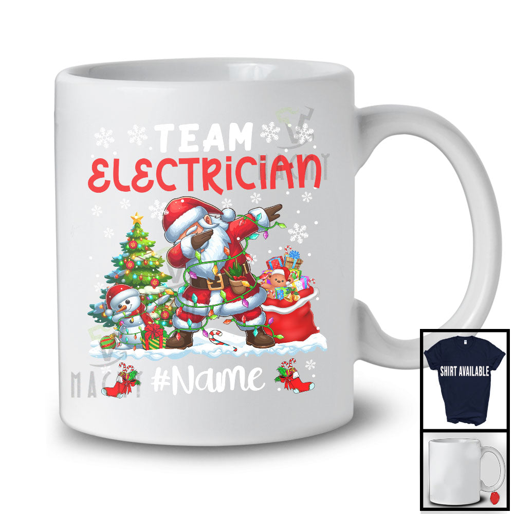 • Personalized Custom Name Team Electrician, Joyful Christmas Santa Snowman Dabbing, Careers T-Shirt. This cotton t-shirt is a durable staple product with a classic fit. One of the most popular items, it has a relaxed style made for everyday and casual wear.