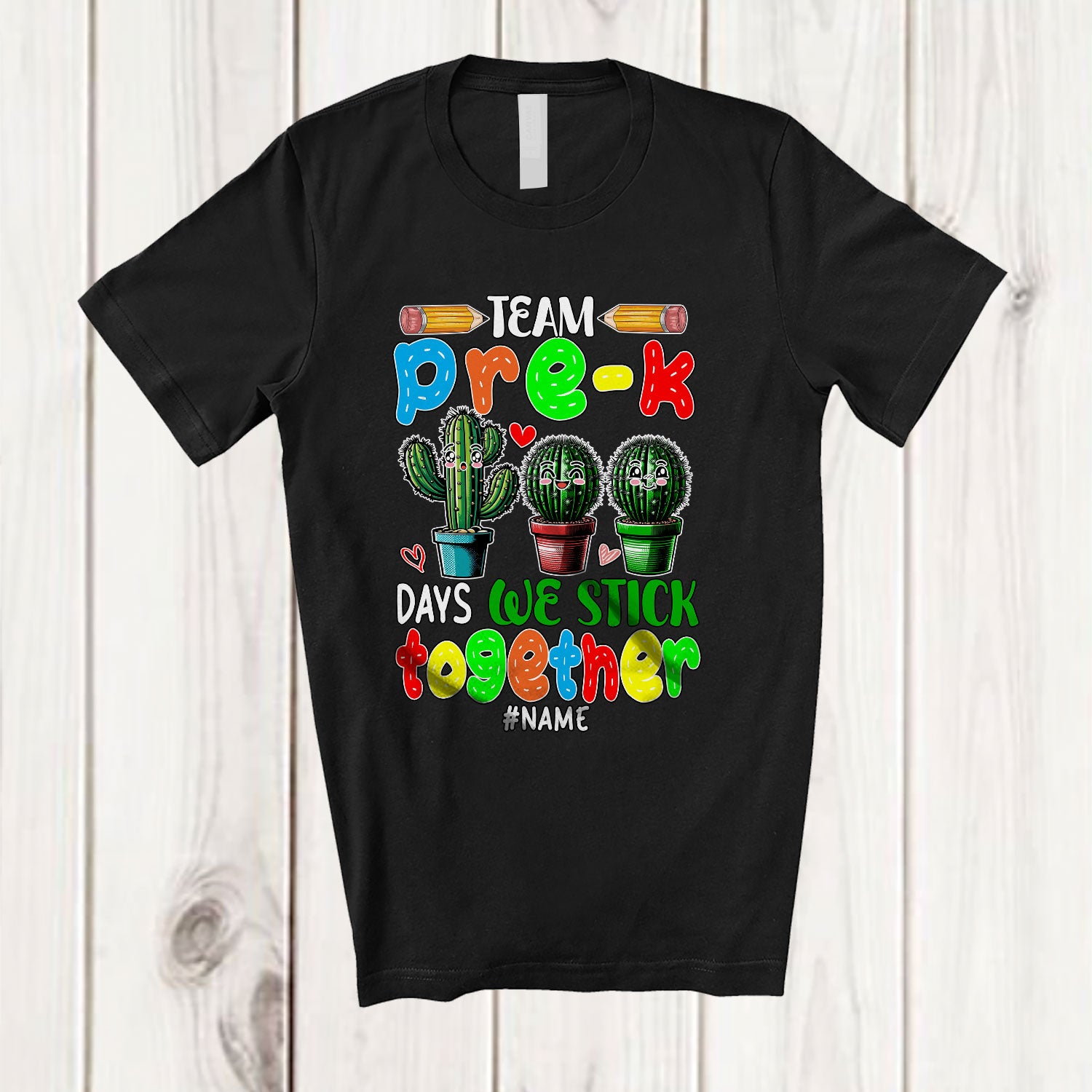 Personalized Custom Name Team Pre-K We Stick; Joyful 100 Days Of School Three Cactus T-Shirt. This cotton t-shirt is a durable staple product with a classic fit. One of the most popular items, it has a relaxed style made for everyday and casual wear.
