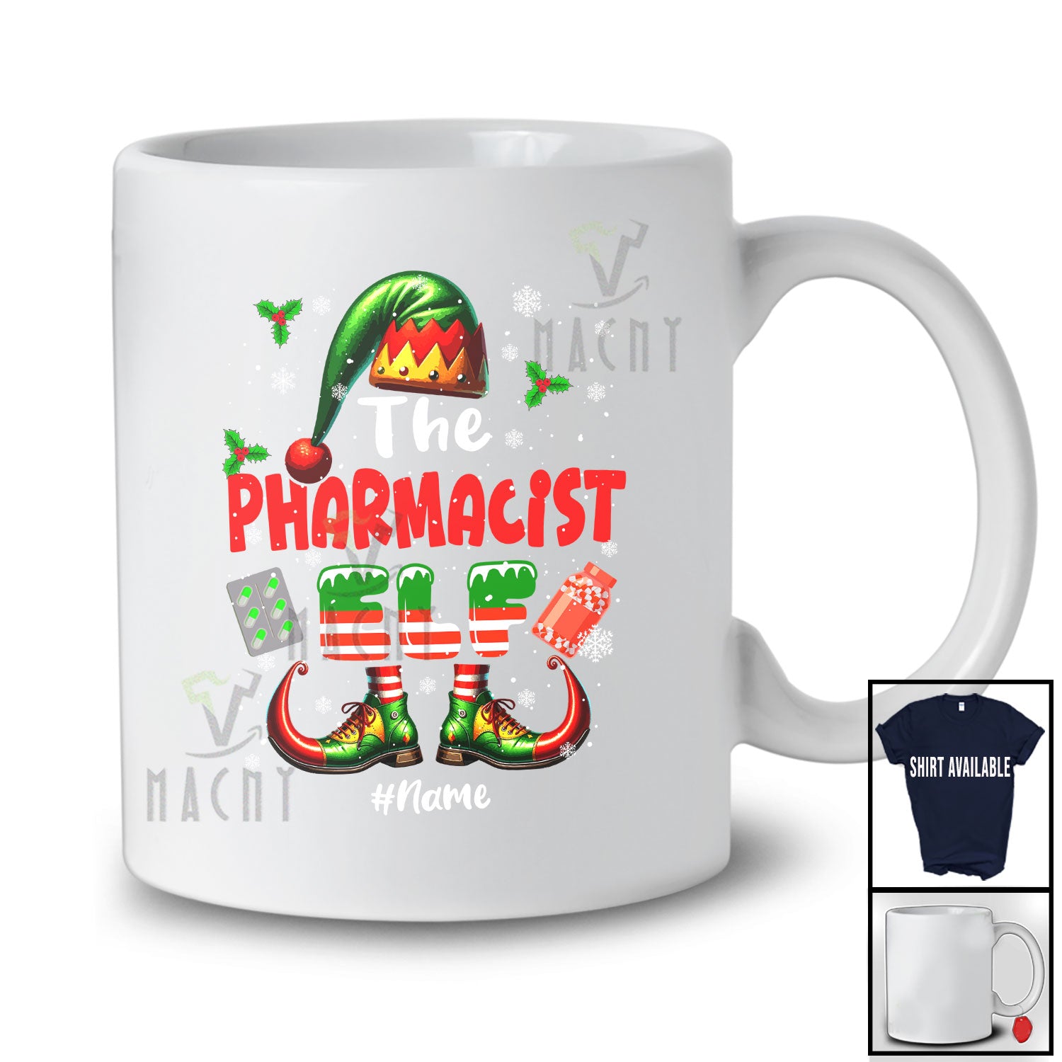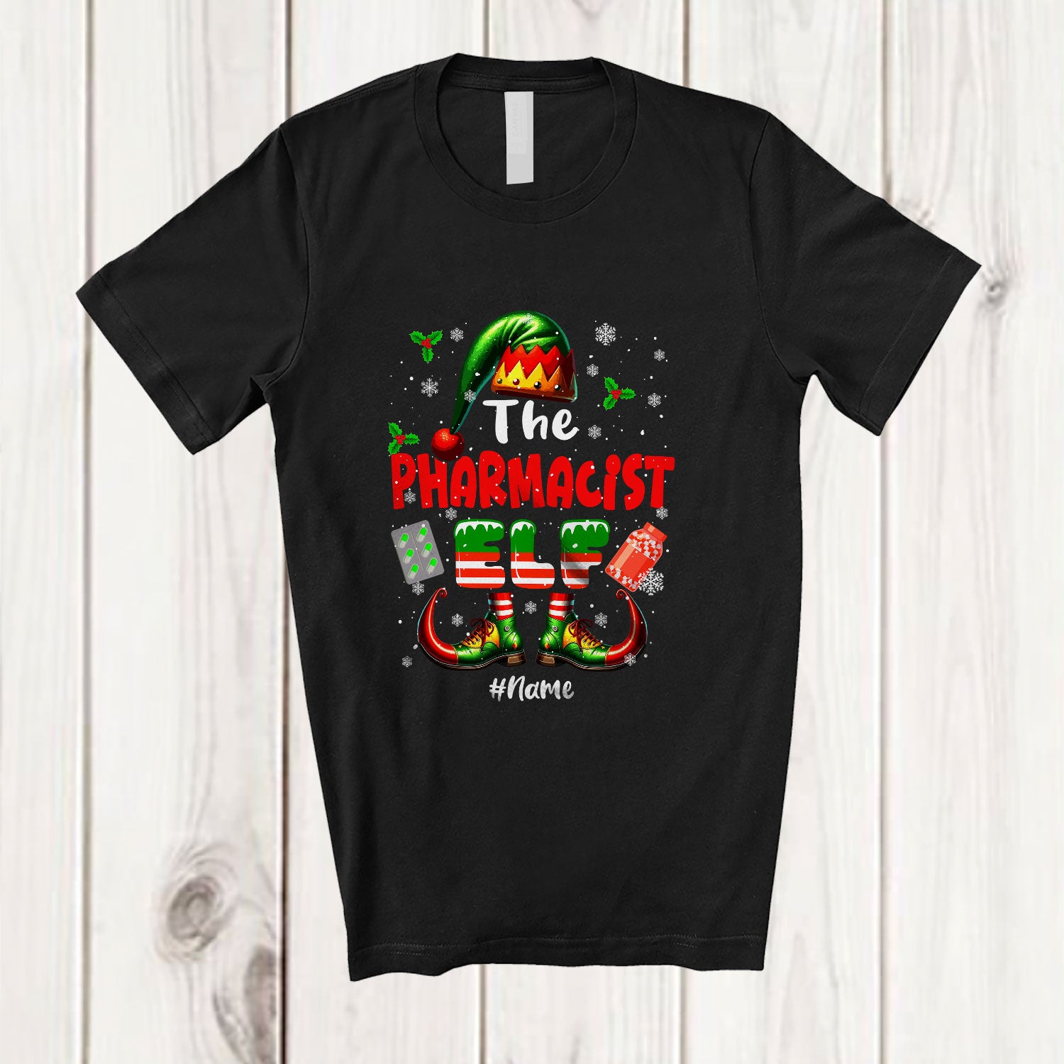 • Personalized Custom Name The Pharmacist Elf; Joyful Christmas Elf Snow Around; Family T-Shirt. This cotton t-shirt is a durable staple product with a classic fit. One of the most popular items, it has a relaxed style made for everyday and casual wear.