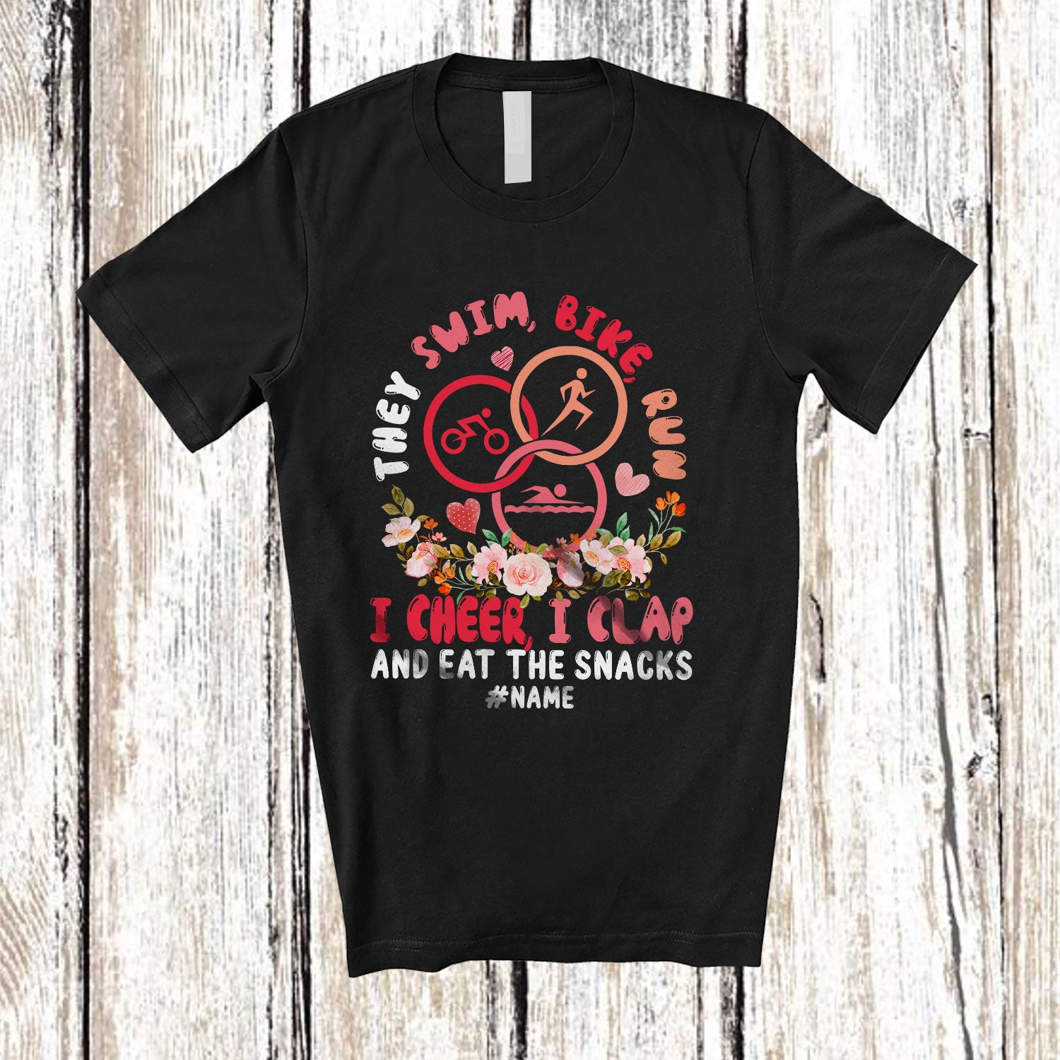 Personalized Custom Name They Swim Bike Run; Amazing Groovy Triathlon Triathlete Flowers T-Shirt