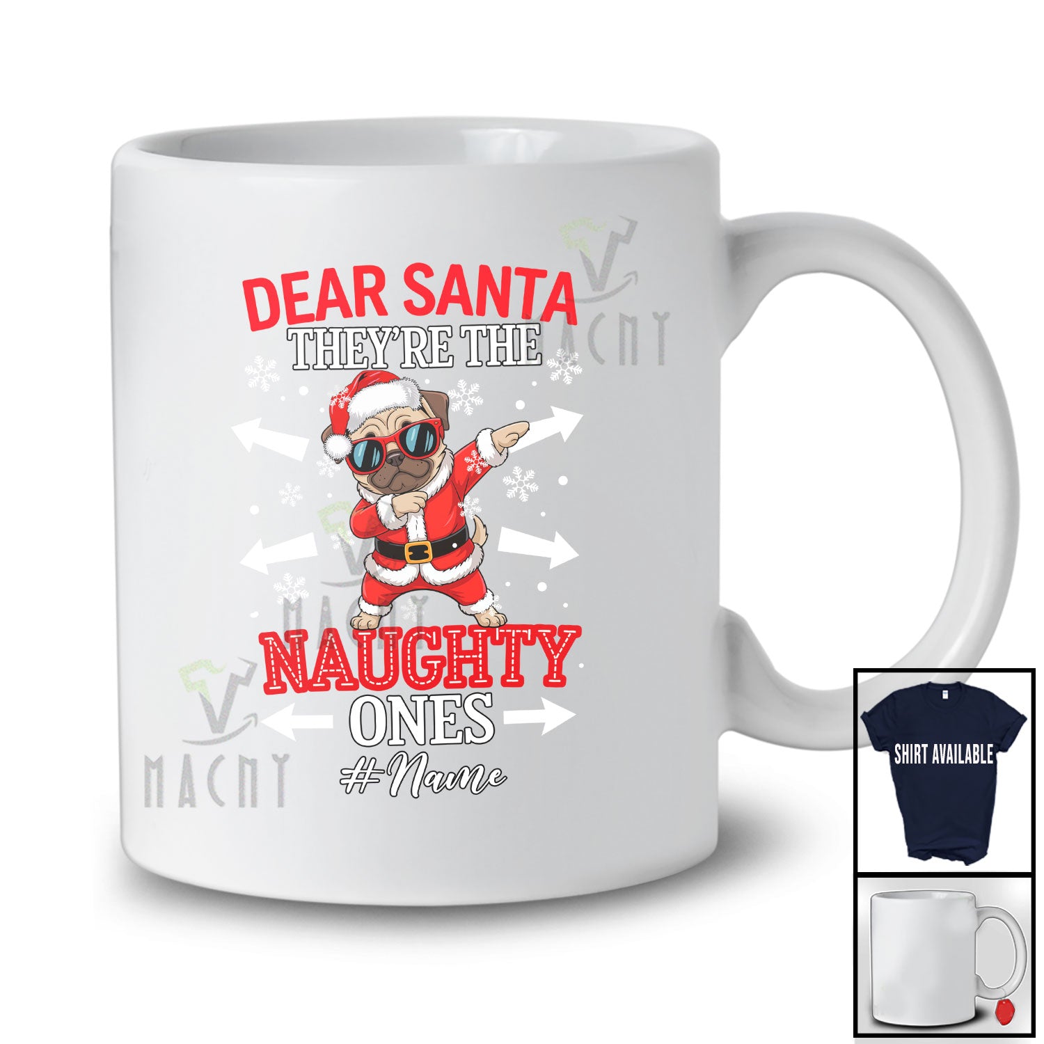 Personalized Custom Name They're The Naughty Ones; Joyful Christmas Dabbing Santa Pug T-Shirt. This cotton t-shirt is a durable staple product with a classic fit. One of the most popular items, it has a relaxed style made for everyday and casual wear.