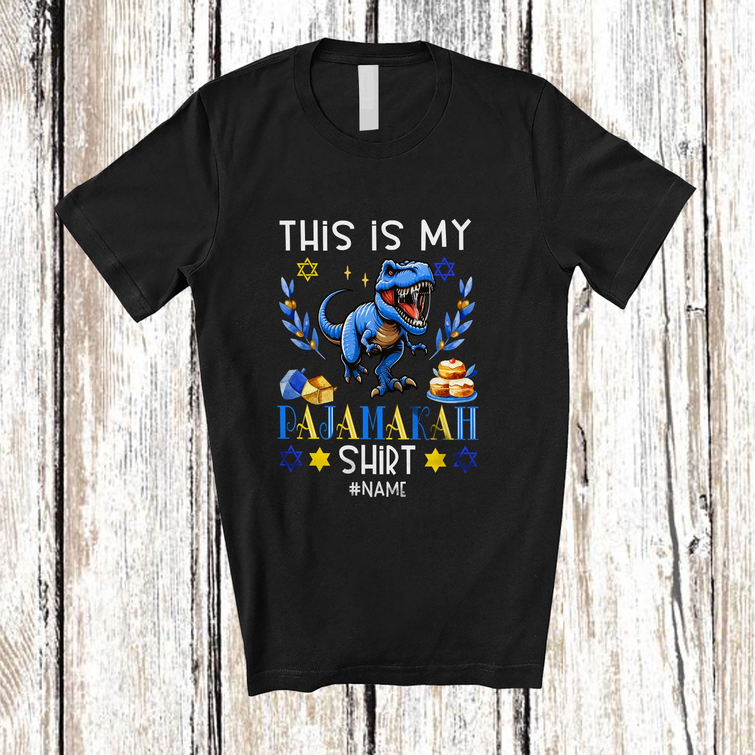 Personalized Custom Name This Is My Pajamakah; Humorous Hanukkah Pajama T-Rex; Family T-Shirt. This cotton t-shirt is a durable staple product with a classic fit. One of the most popular items, it has a relaxed style made for everyday and casual wear.