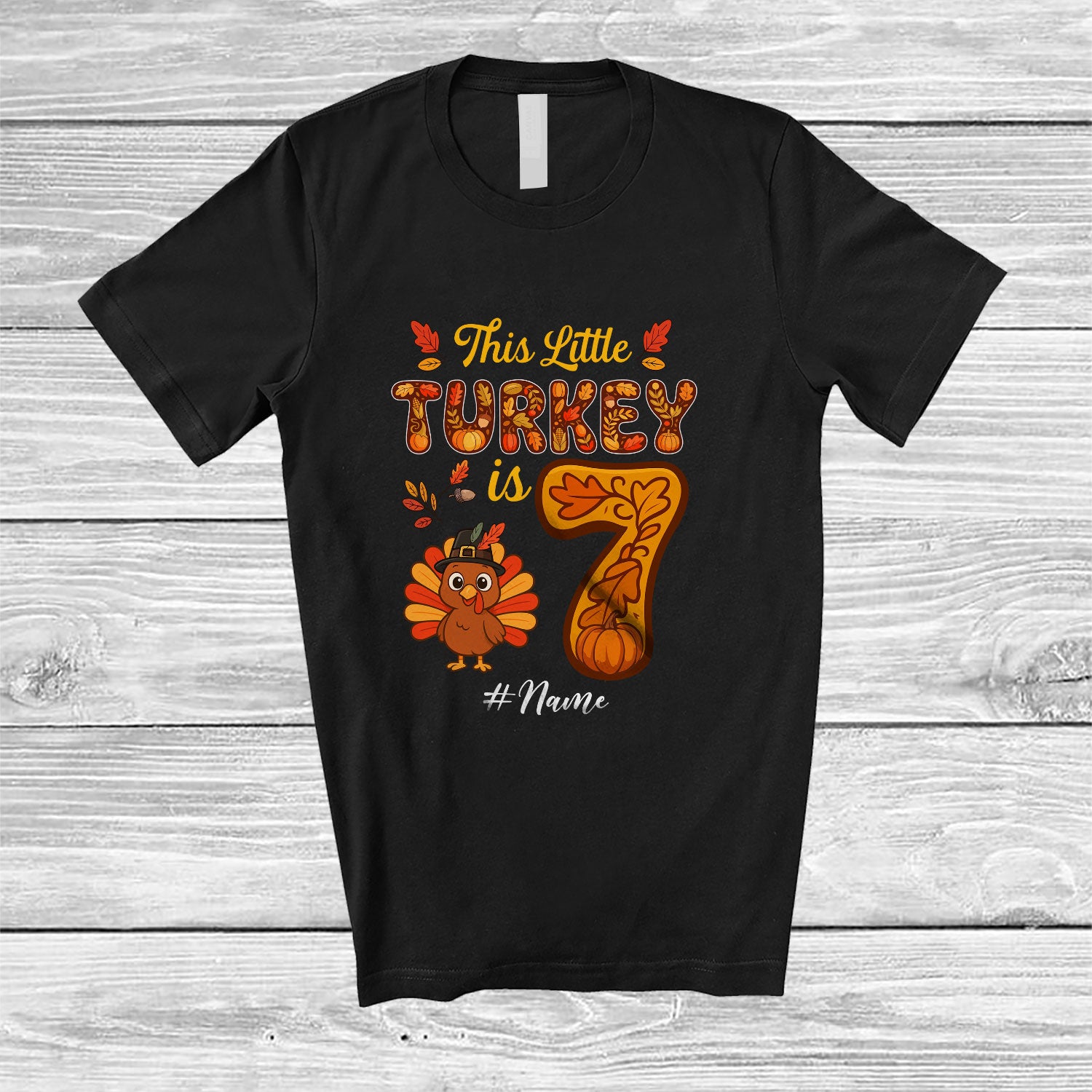 Personalized Custom Name This Little Turkey Is 7; Joyful 7th Birthday Thanksgiving Fall Family T-Shirt