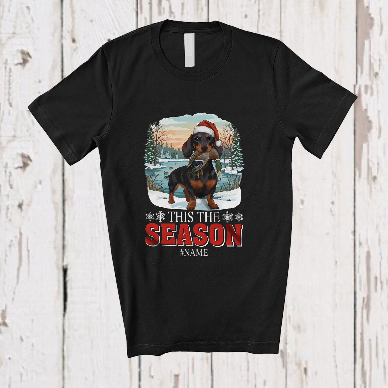 • Personalized Custom Name This The Season; Joyful Christmas Santa Dachshund Hunting Hunter T-Shirt. This cotton t-shirt is a durable staple product with a classic fit. One of the most popular items, it has a relaxed style made for everyday and casual wear.