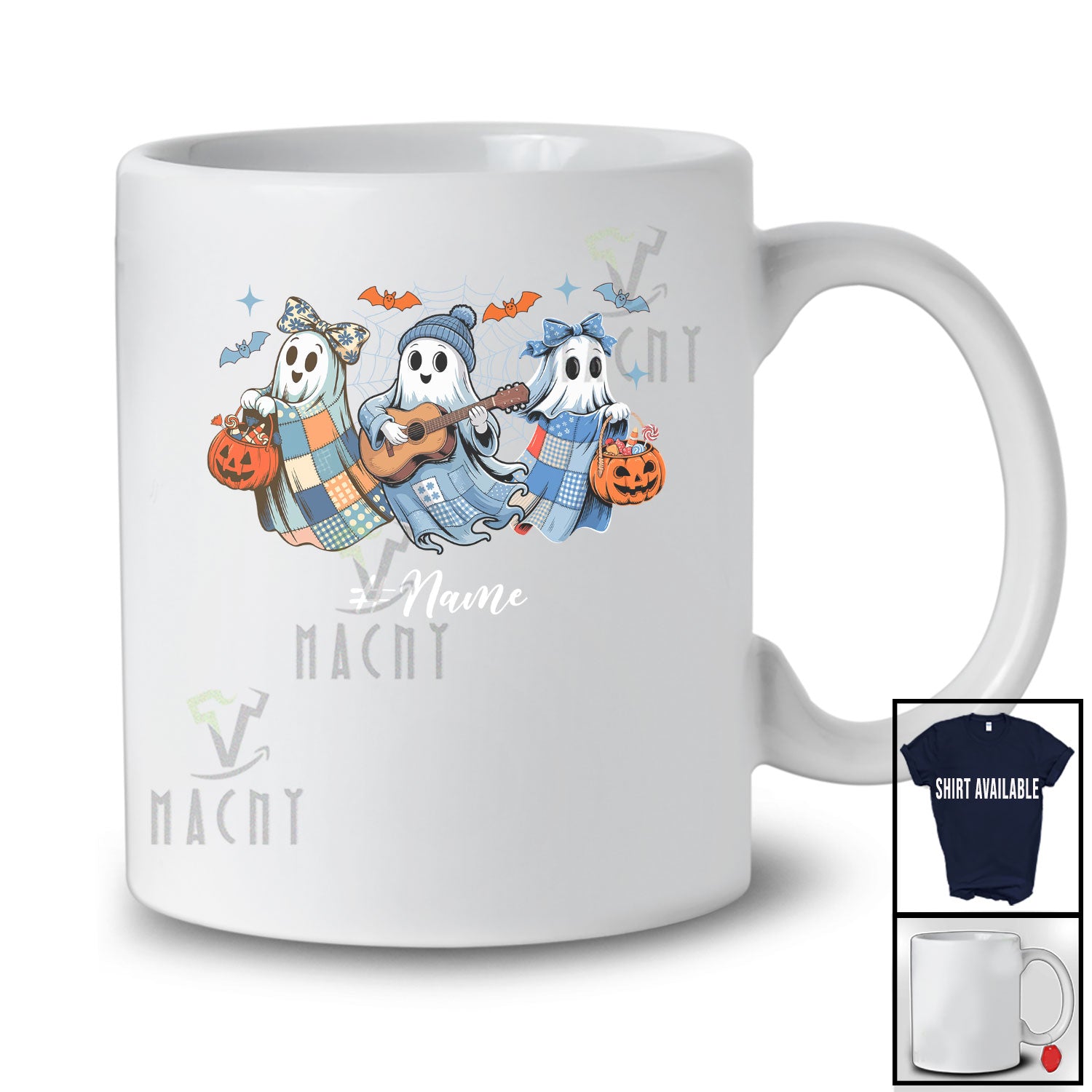 • Personalized Custom Name Three Ghost Boo; Lovely Halloween Playing Guitar Musician T-Shirt. This cotton t-shirt is a durable staple product with a classic fit. One of the most popular items, it has a relaxed style made for everyday and casual wear.