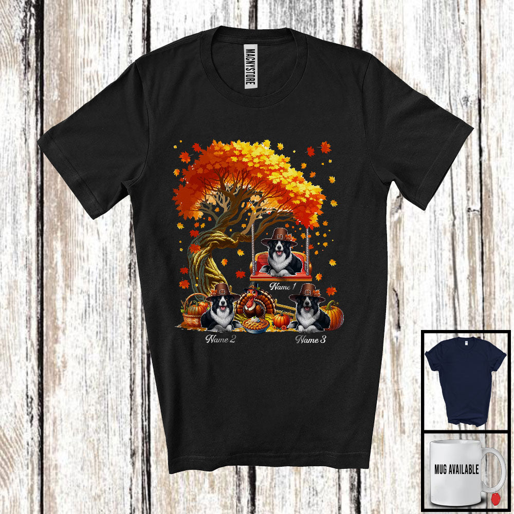 Personalized Custom Name Three Pilgrim Border Collies, Happy Thanksgiving Fall Tree, Family T-Shirt