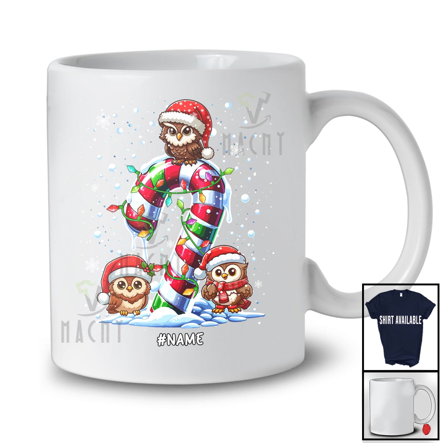 Personalized Custom Name Three Santa Owl On Candy Cane; Amusing Christmas Lights Bird T-Shirt