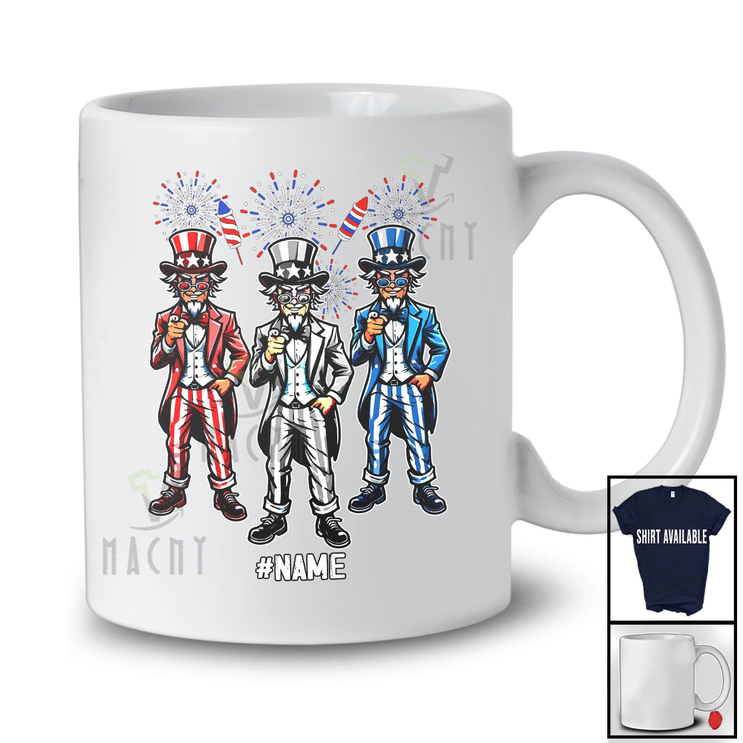 Personalized Custom Name Three Uncle Sam Fireworks; Joyful 4th Of July Fireworks; Patriotic T-Shirt. This cotton t-shirt is a durable staple product with a classic fit. One of the most popular items, it has a relaxed style made for everyday and casual wear.