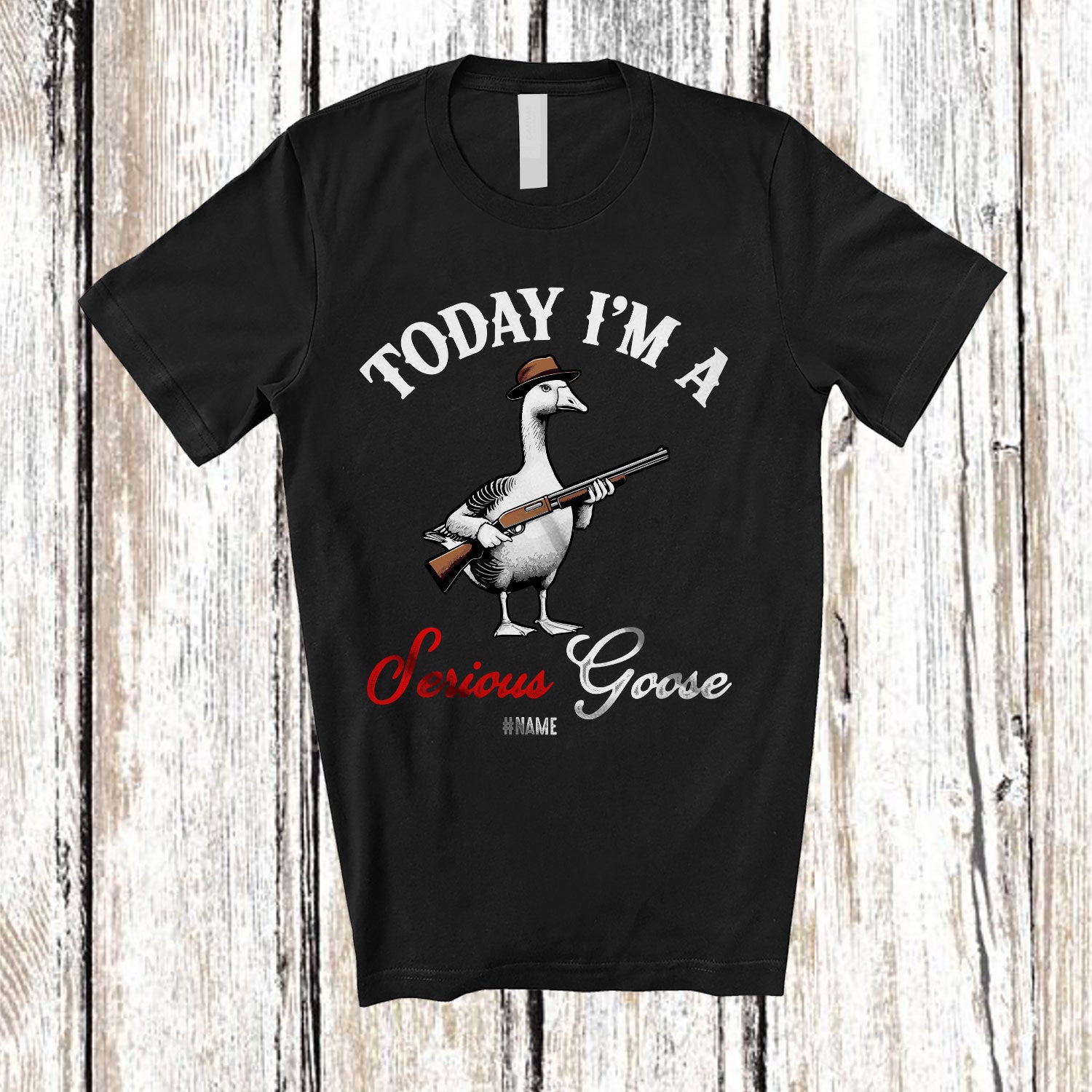 Personalized Custom Name Today I'm A Serious Goose; Humorous Farmer Goose Gun; Family T-Shirt. This cotton t-shirt is a durable staple product with a classic fit. One of the most popular items, it has a relaxed style made for everyday and casual wear.
